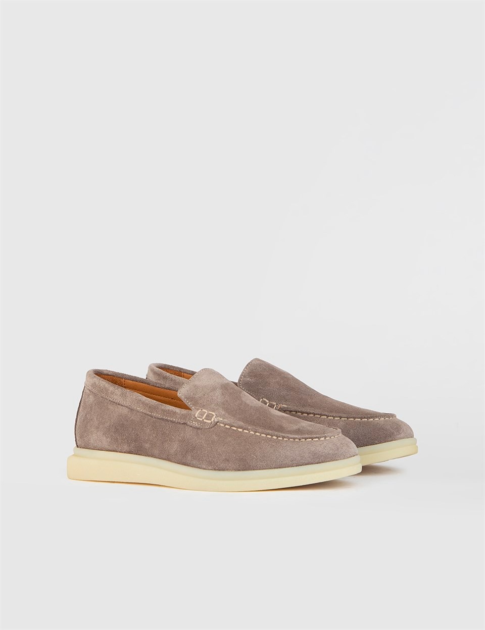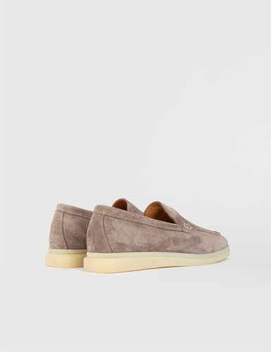 Серо-бежевые замшевые кожаные женские лоферы. Изготовлено из высококачественной телячьей кожи. Bысота подошвы: 2 см. Резиновая подошва. Ручная работа.