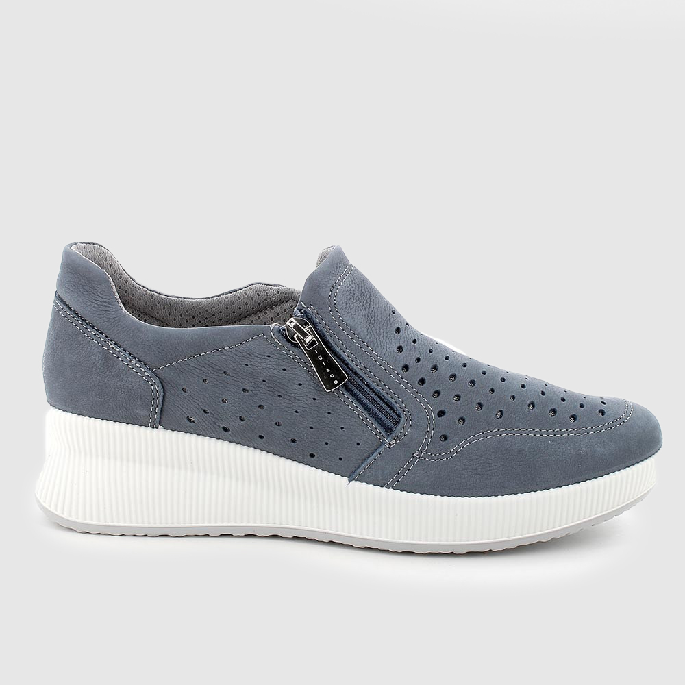 Современная обувь из мягкой перфорированной натуральной кожи и текстильной подкладки. Ширина модели регулируется благодаря боковой молнии и эластичной резинки.