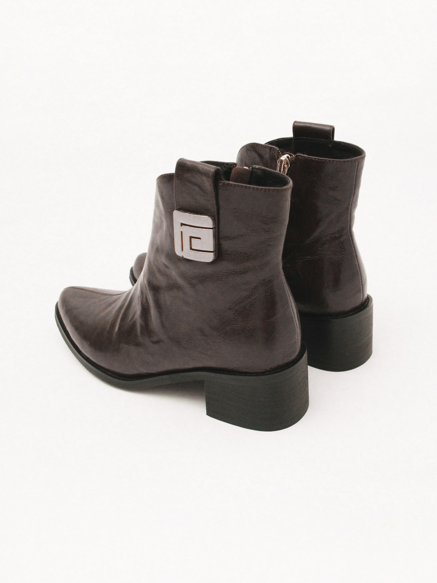 Демисезонные ботинки тёмно-бордового цвета из натуральной кожи с фактурной поверхностью. Полусапожки украшены металлическим декором в верхней части изделия. Стильная, комфортная пара на невысоком устойчивом каблуке. Обувь утеплена байкой.