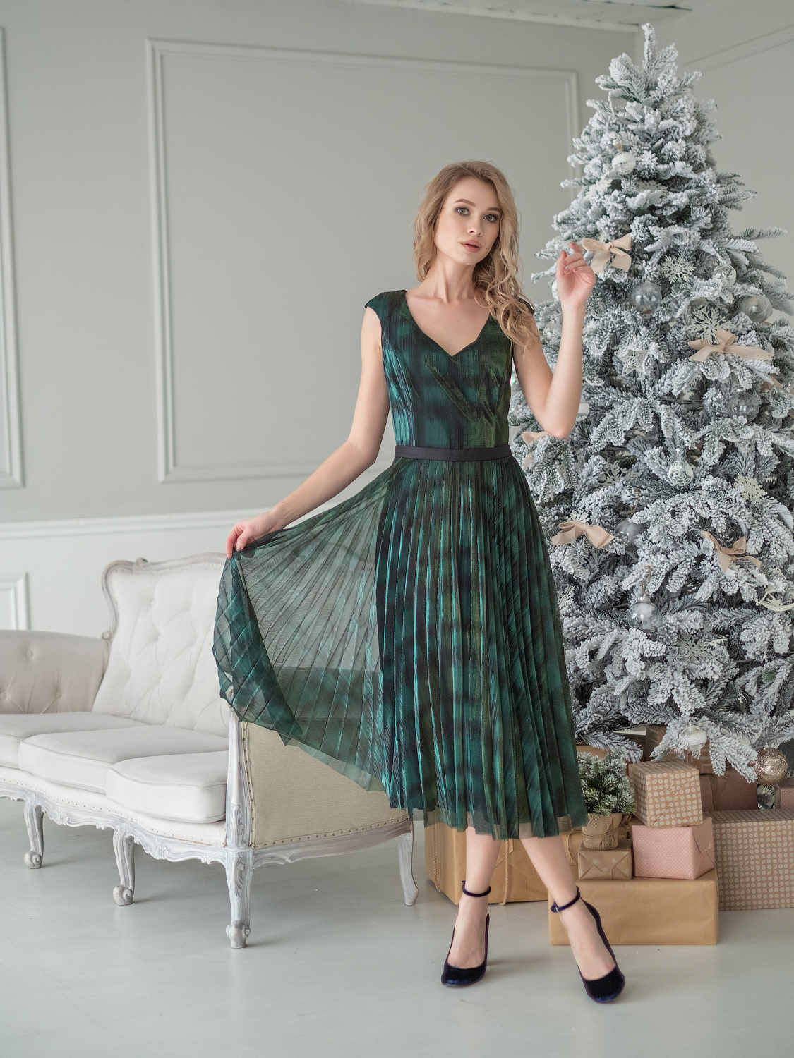 На сайте указаны российские размеры. Яркое платье-хамелеон приталенного кроя. Дина миди, вырез горловины – фигурное каре. Пояс на талии отделяет плиссированную часть платья. Отсутствие рукавов выгодно подчеркнет руки. Платье создано, чтобы притягивать восторженные взгляды на новогодней вечеринке или любом вечернем мероприятии!