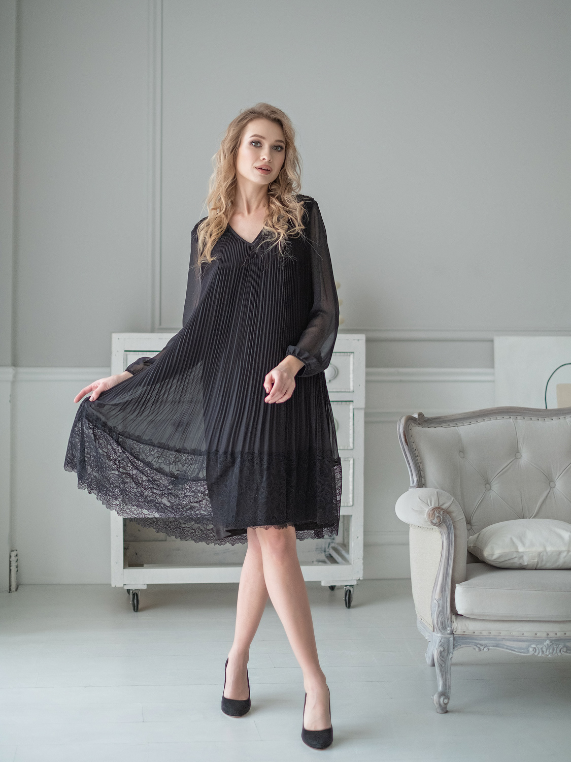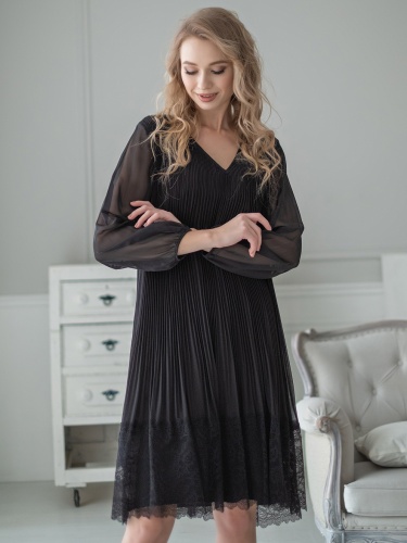 Плиссированное платье-трапеция, украшенное кружевом по низу изделия, идеально сгладит любые недостатки фигуры и подчеркнет достоинства. V-образный вырез, рукав епископа, длина платья – до середины колена.