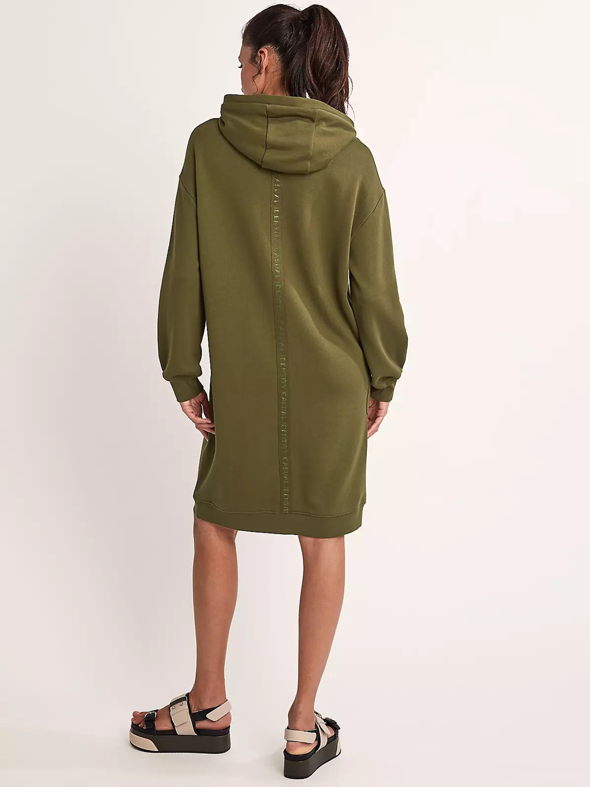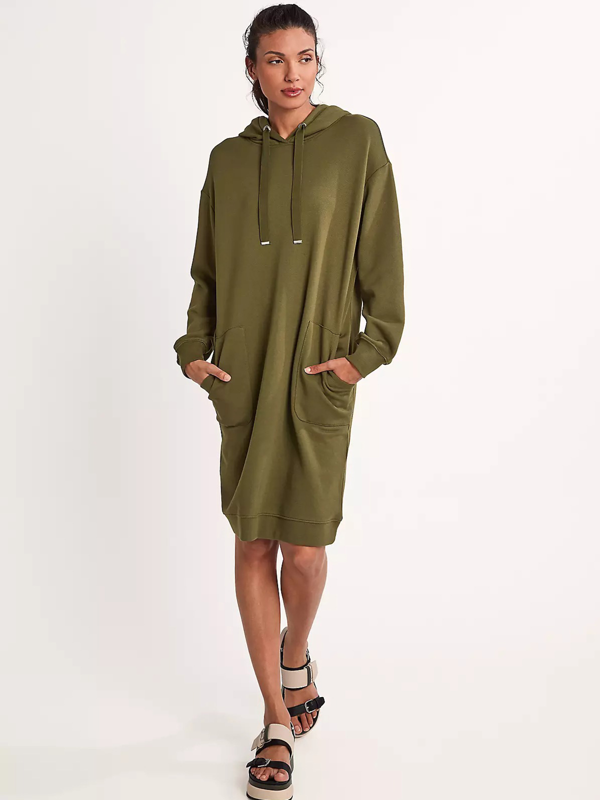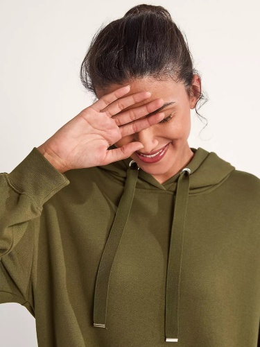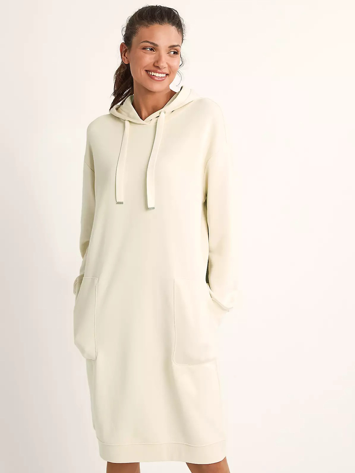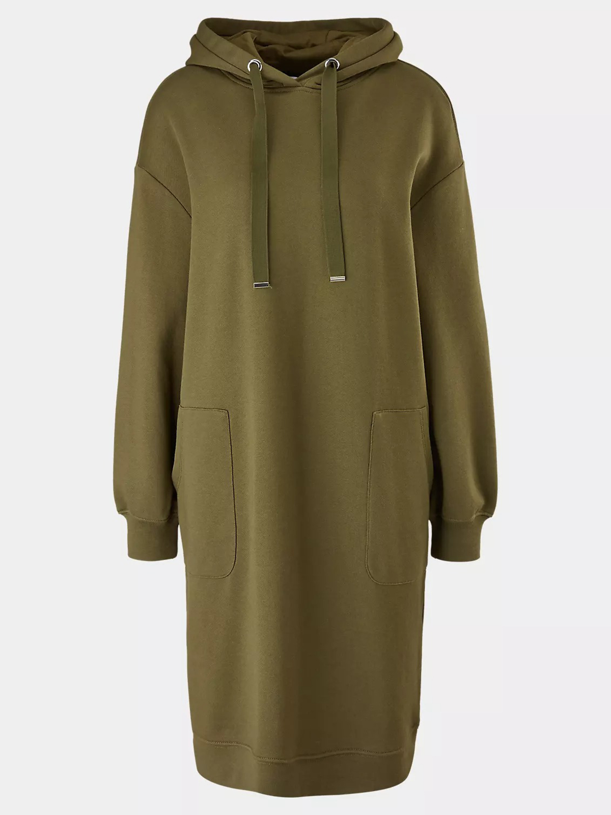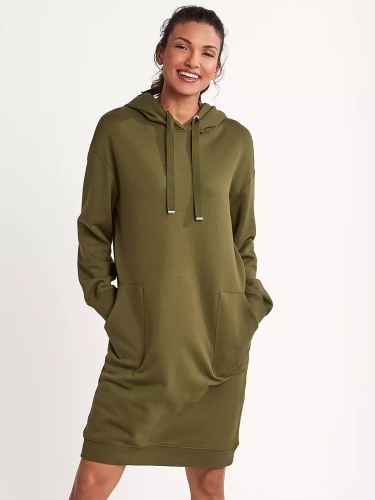 Однотонное платье-толстовка в спортивном стиле. Свободный силуэт, длина мини. Объемный капюшон с кулиской. Накладные карманы спереди. Длинные втачные рукава с манжетой. Эластичная резинка по низу подола.
