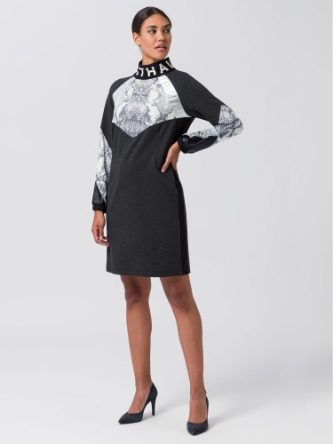 Стильное экстравагантное платье в спортивном стиле со вставками в питоновом узоре и экокоже. Длина мини, полуприталенный силуэт. Широкий воротник стойка украшен надписью.