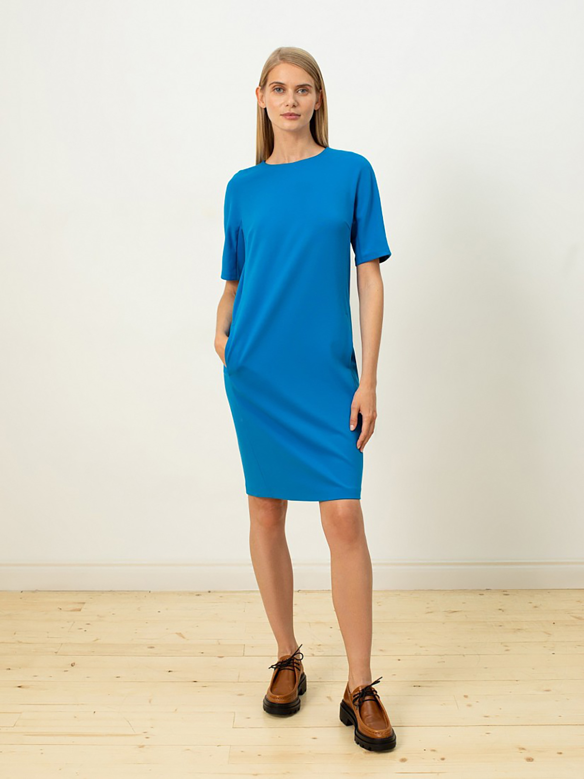 Однотонное платье прямого кроя с круглой горловиной, коротким рукавом кимоно и рельефами на спинке и переде.