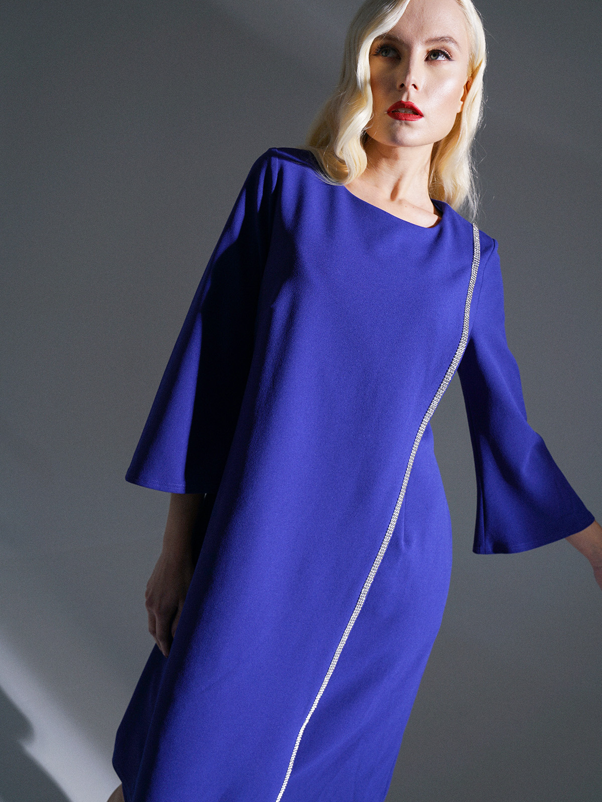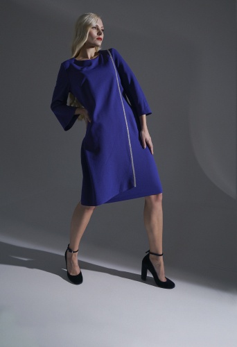 На сайте указаны российские размеры. Однотонное платье оригинального кроя. Роскошный и насыщенный оттенок синего, декор лентой серебряного цвета по борту запаха. Расклешенный рукав 3/4.