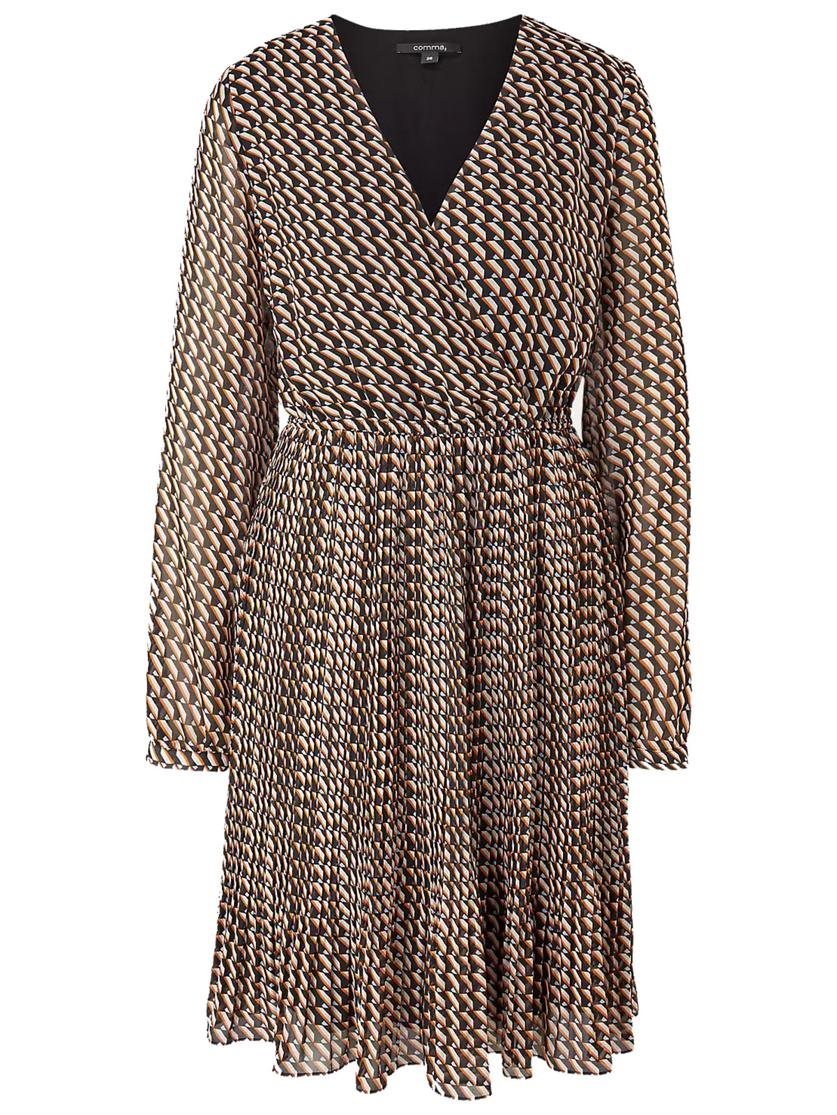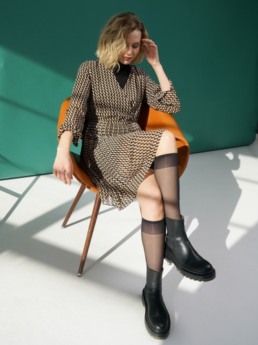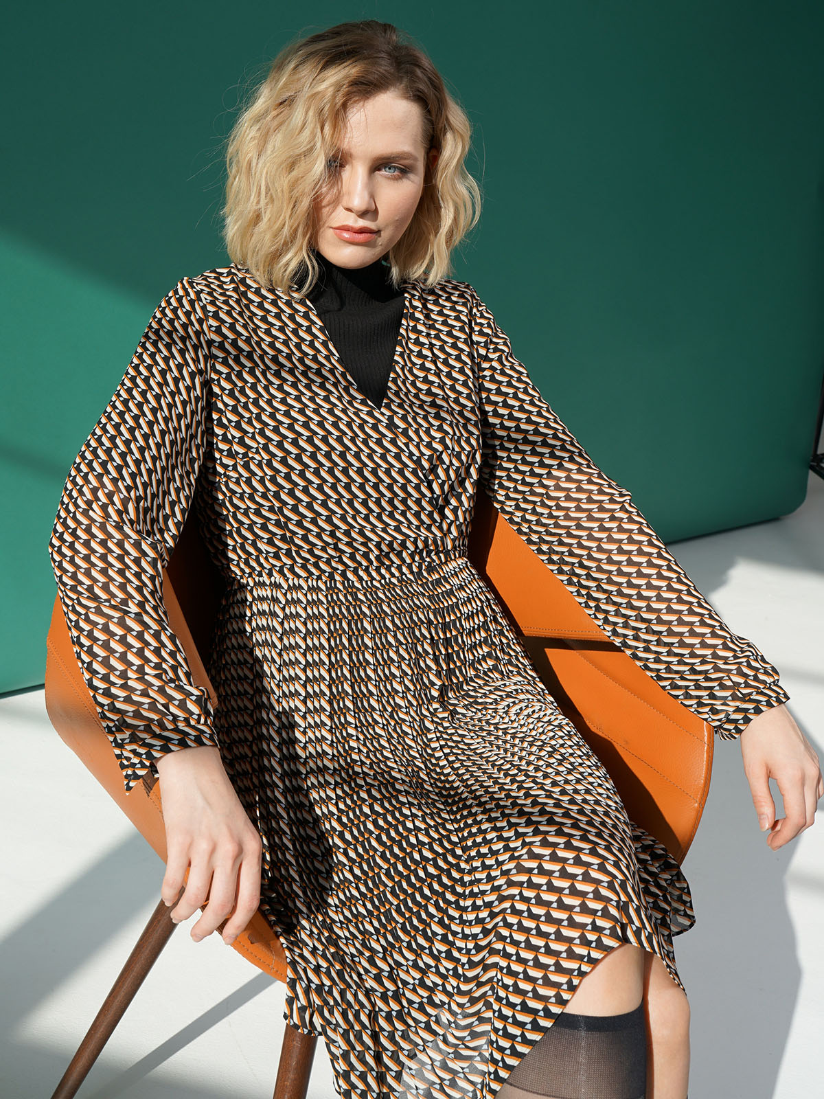 Платье длины миди с абстрактным геометрическим узором по всей поверхности. Приталенный силуэт, V-образный вырез горловины, длинные втачные рукава. Платье подойдет для создания образов городском повседневном стиле.