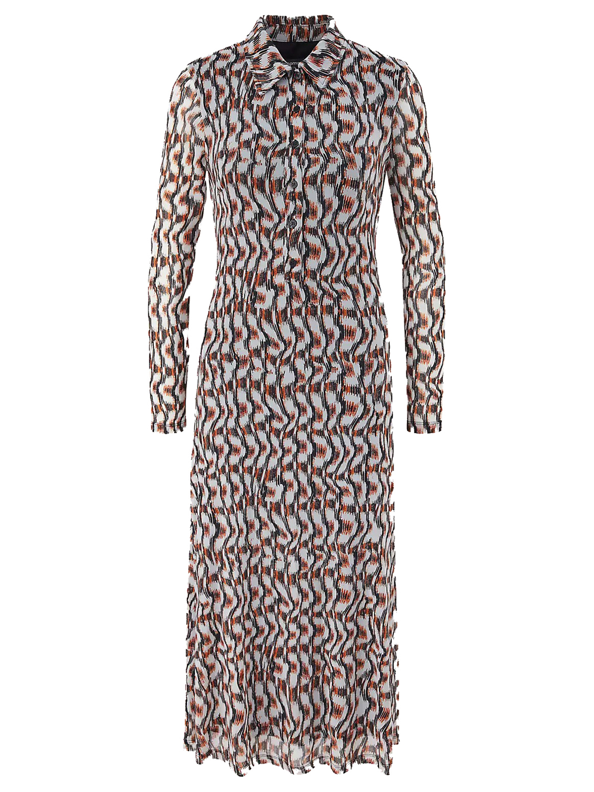Платье миди длины с абстрактным геометрическим узором по всей поверхности изделия. Полуприталенный силуэт. Отложной рубашечный воротник, планка с пуговицами. Длинный втачной рукав. Платье подойдет для образов в повседневном городском стиле.