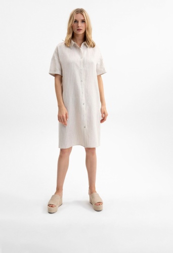 Льняное платье-рубашка свободного кроя. Длина миди. Отложной рубашечный воротник. Короткий втачной рукав с отворотом. Застежка на пуговицы.