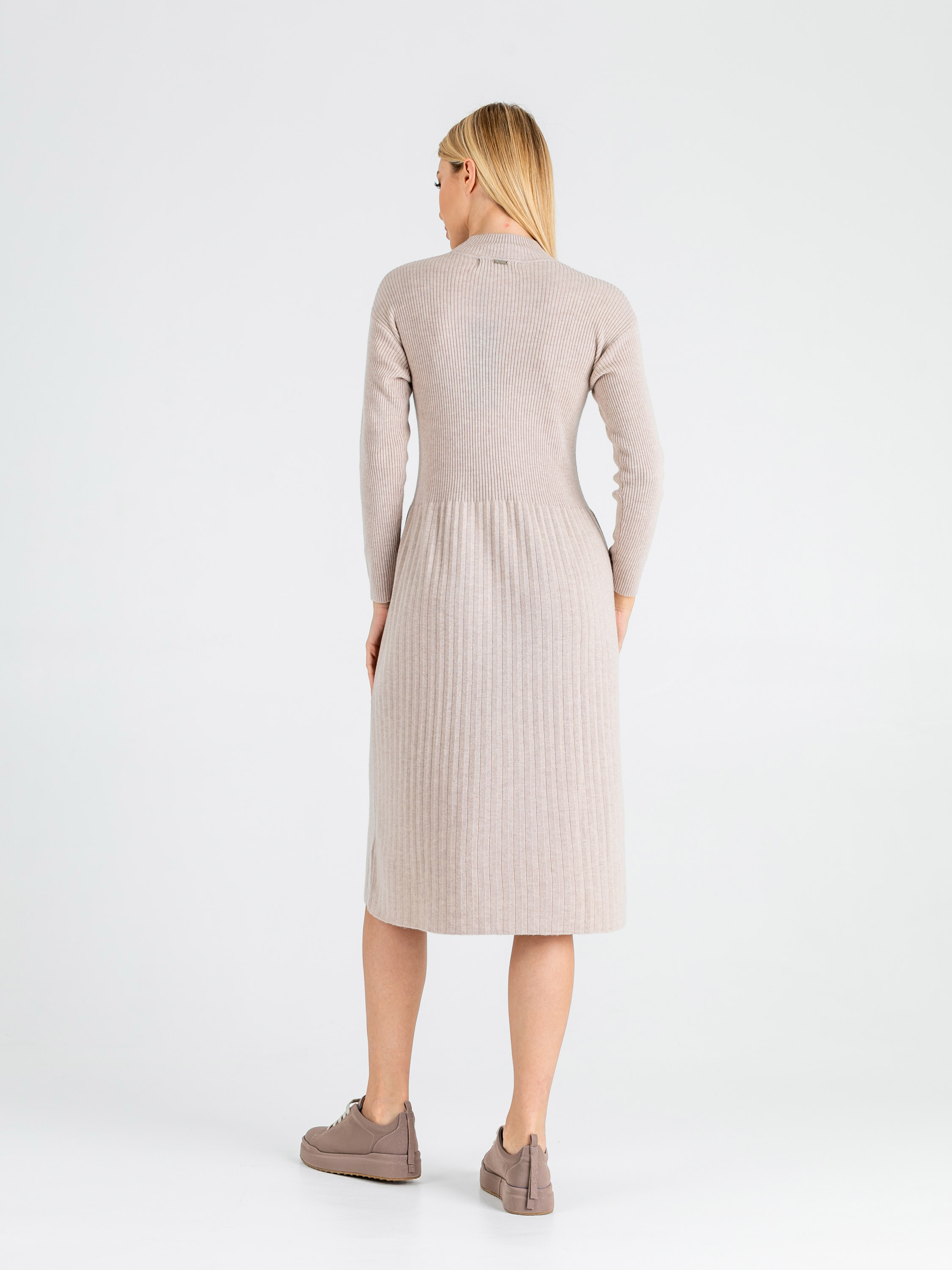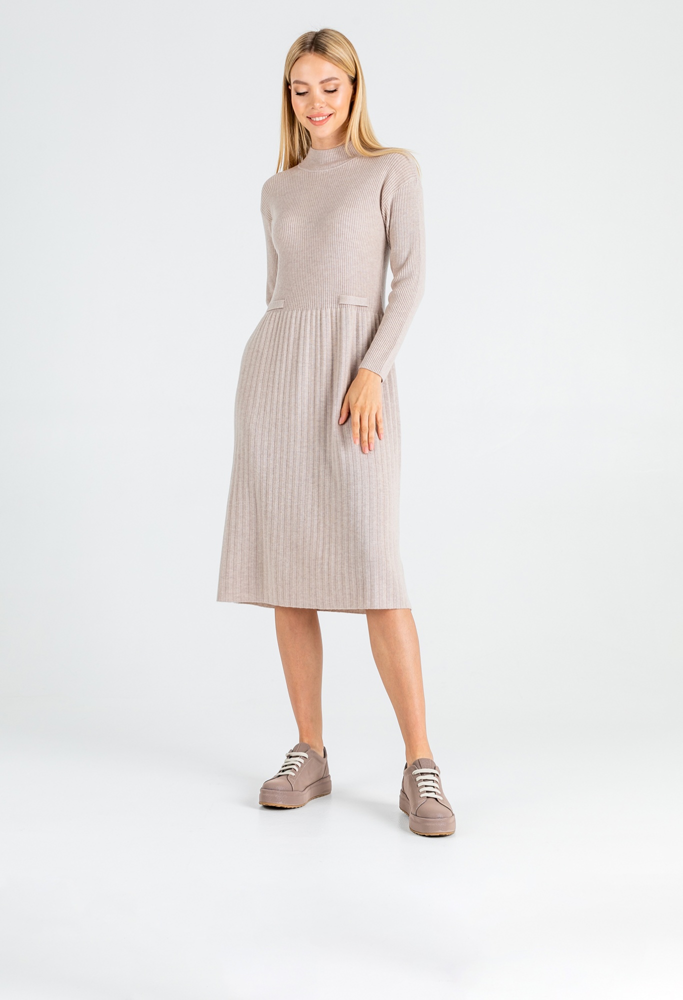 На сайте указаны российские размеры. Крой: женственное приталенное платье с длинным рукавом. Плиссированная, слегка расклешенная книзу юбка, удачно скрывает узкие бедра и добавляет объема, если его недостаёт или, наоборот, маскирует возможные нюансы в области живота и бедер. Стильная базовая модель с круглым, слегка поднятым вырезом, прикрывающим часть шеи. Длина ниже колена – идеальный вариант для создания как рабочего, так и сдержанного торжественного образов. Изготовлено из 100% шерсти, теплое и приятное телу. Отделка: состоит из двух видов фактур: верхняя часть платья – в мелкий рубчик, нижняя – среднее гофре. Чуть выше талии расположена имитация карманов. Сочетайте с высокими сапогами-трубами, ботинками на грубой подошве и спортивной обувью. Рост 177 см