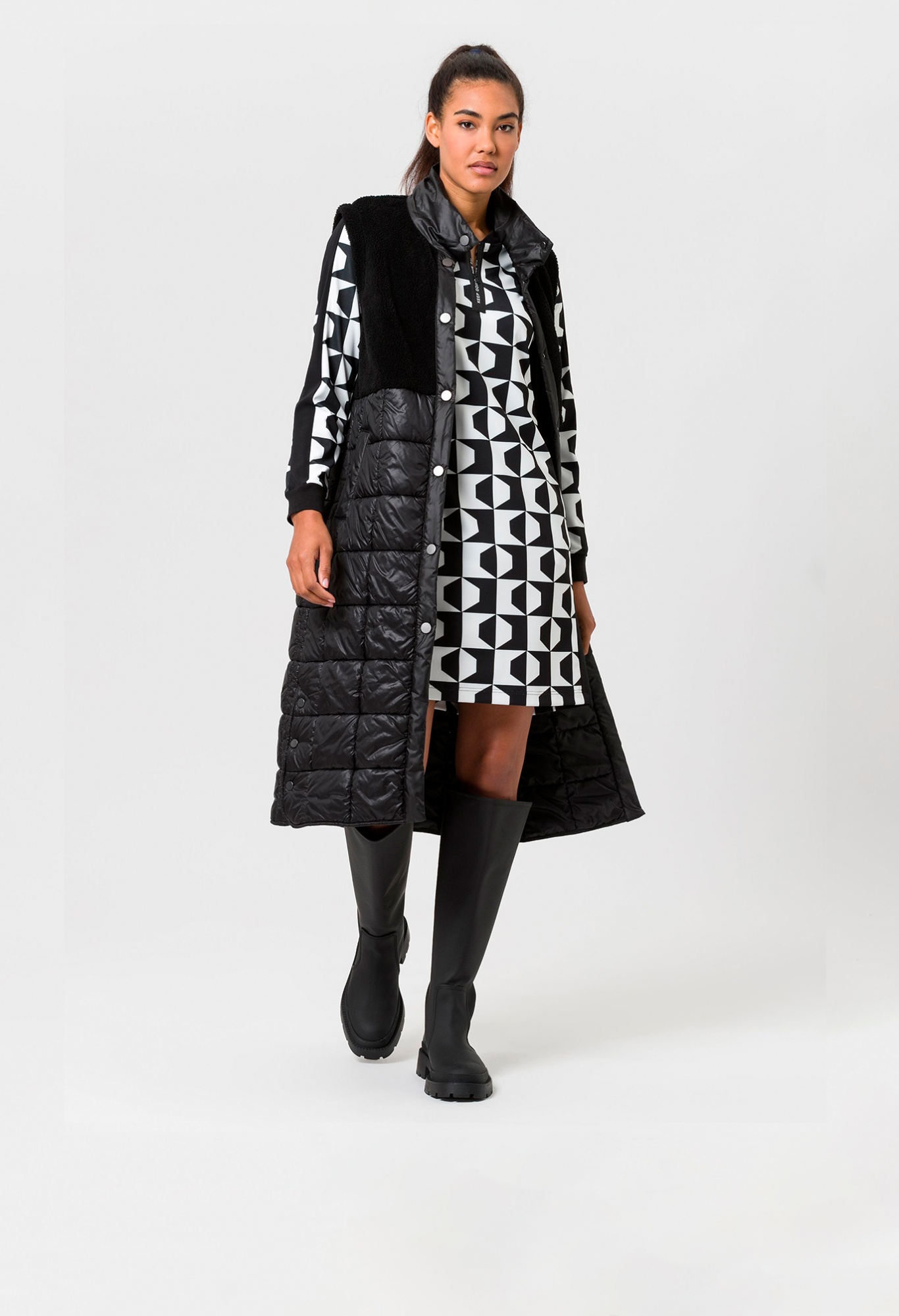 На сайте указаны российские размеры. Спортивное платье – абсолютный must have для уверенных в себе женщин. От воротника-стойки до потайной молнии с мотивирующей типографской деталью, от слегка зауженного кроя до контрастного принта по всей поверхности. Маленькая, но изящная деталь: карманы в боковых швах на молнии.
