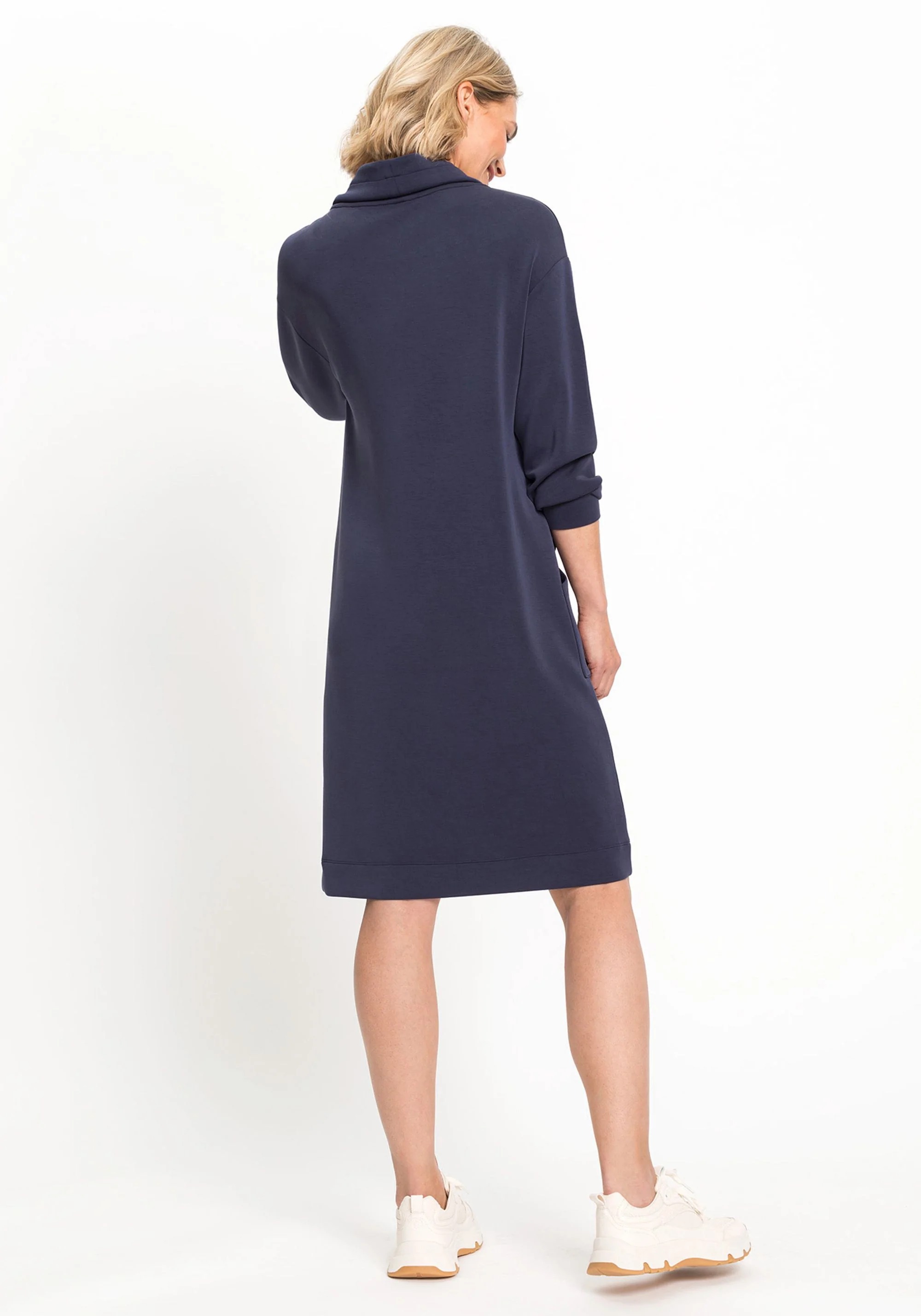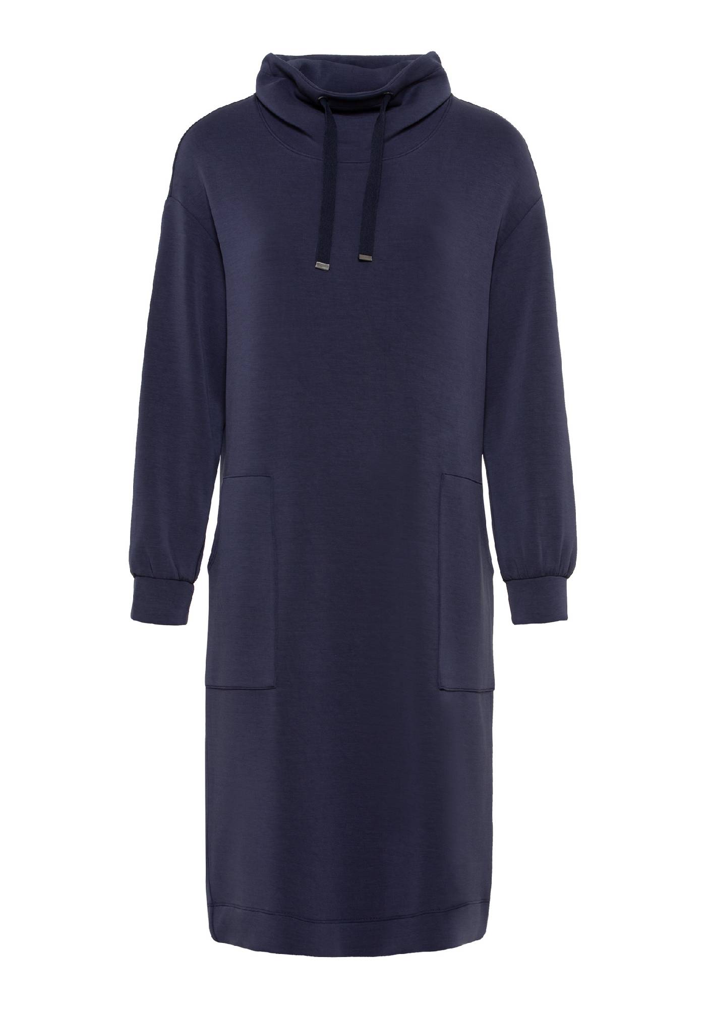 На сайте указаны российские размеры. Прямое спортивное платье со свободным воротником-стойкой на шее. Два передних кармана с акцентной строчкой. Длинные рукава отделаны резинкой. Длина: 100 см в 44 размере.