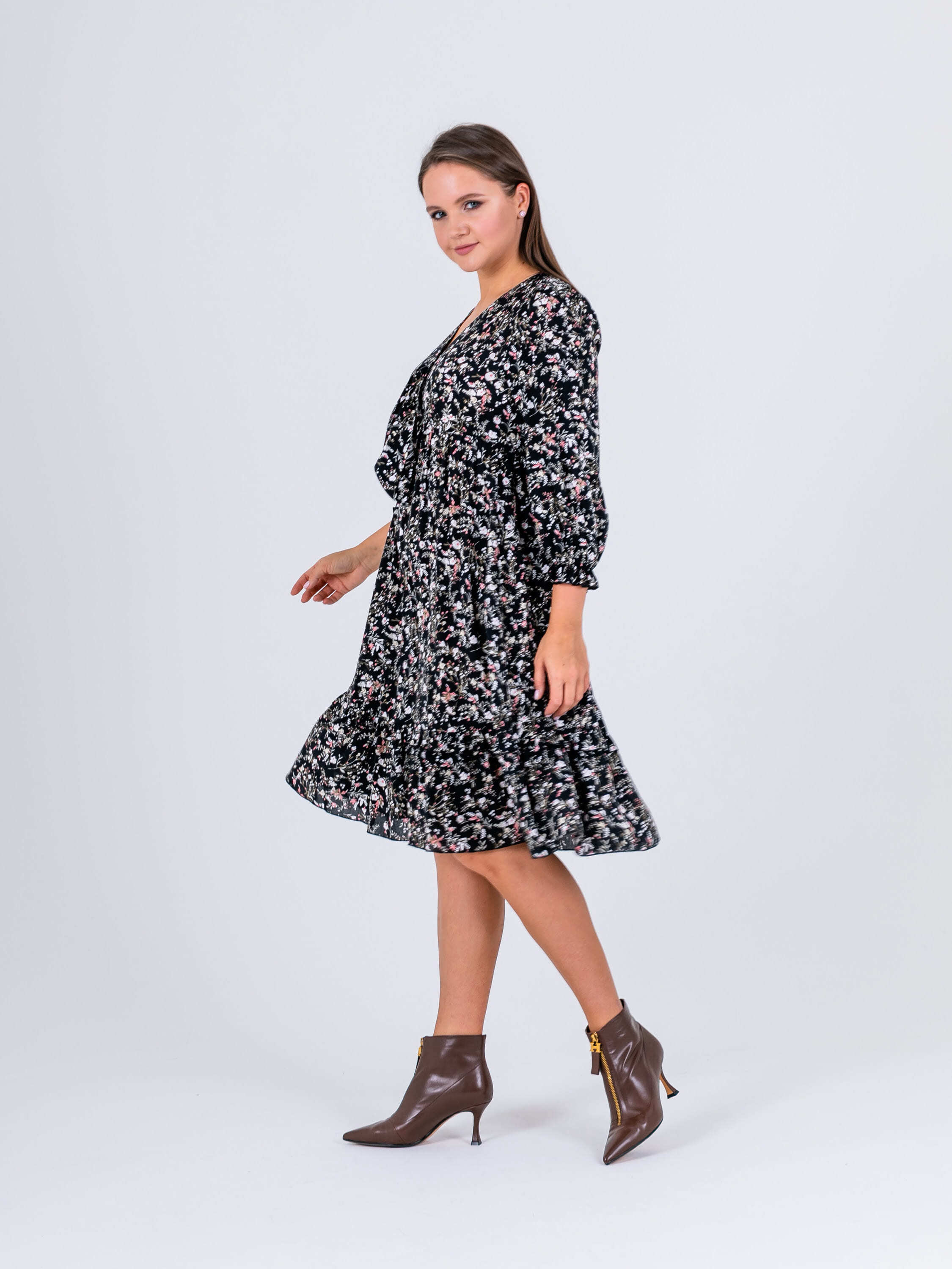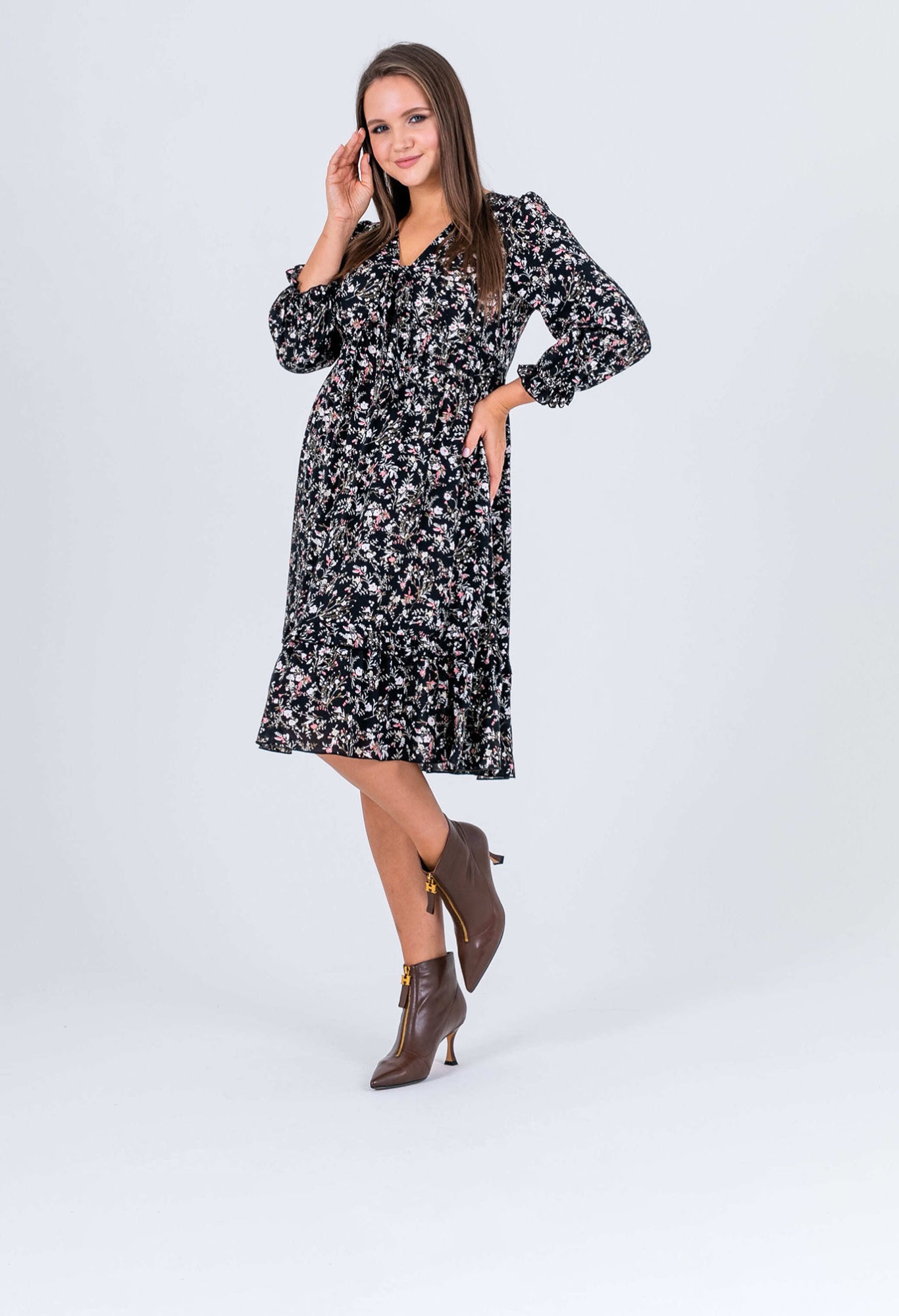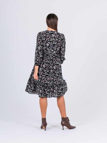 На сайте указаны российские размеры. Крой: платье свободного силуэта из гладкой вискозы в стиле бохо. Отрезное под грудью, расклешенное, имеет втачной рукав, низ которого собран на эластичную тесьму, что позволяет фиксировать его на комфортную высоту и разный объем рук. Платье состоит из двух ярусов, которые выгодное подчеркивают достоинства фигуры и изысканно маскируют недостатки. Платье подойдет женщинам разных фигур и комплекций, а в особенности будущим мамам и прекрасным обладательницам шикарных форм. Отделка: ткань в мелкий цветок создает женственный и романтичный образ, который влюбляет в себя с первого взгляда. Сочетайте с однотонными жакетами и кардиганами из ассортимента Stern.