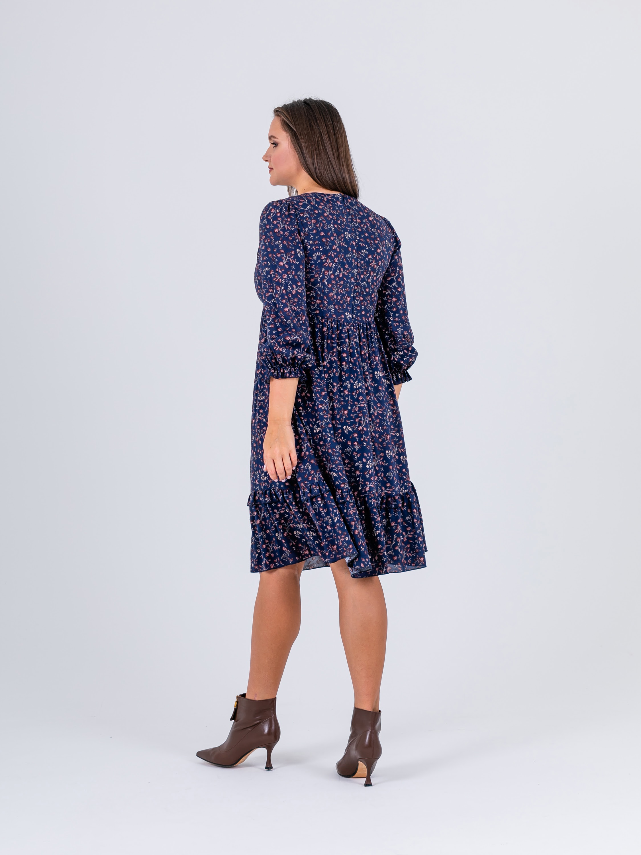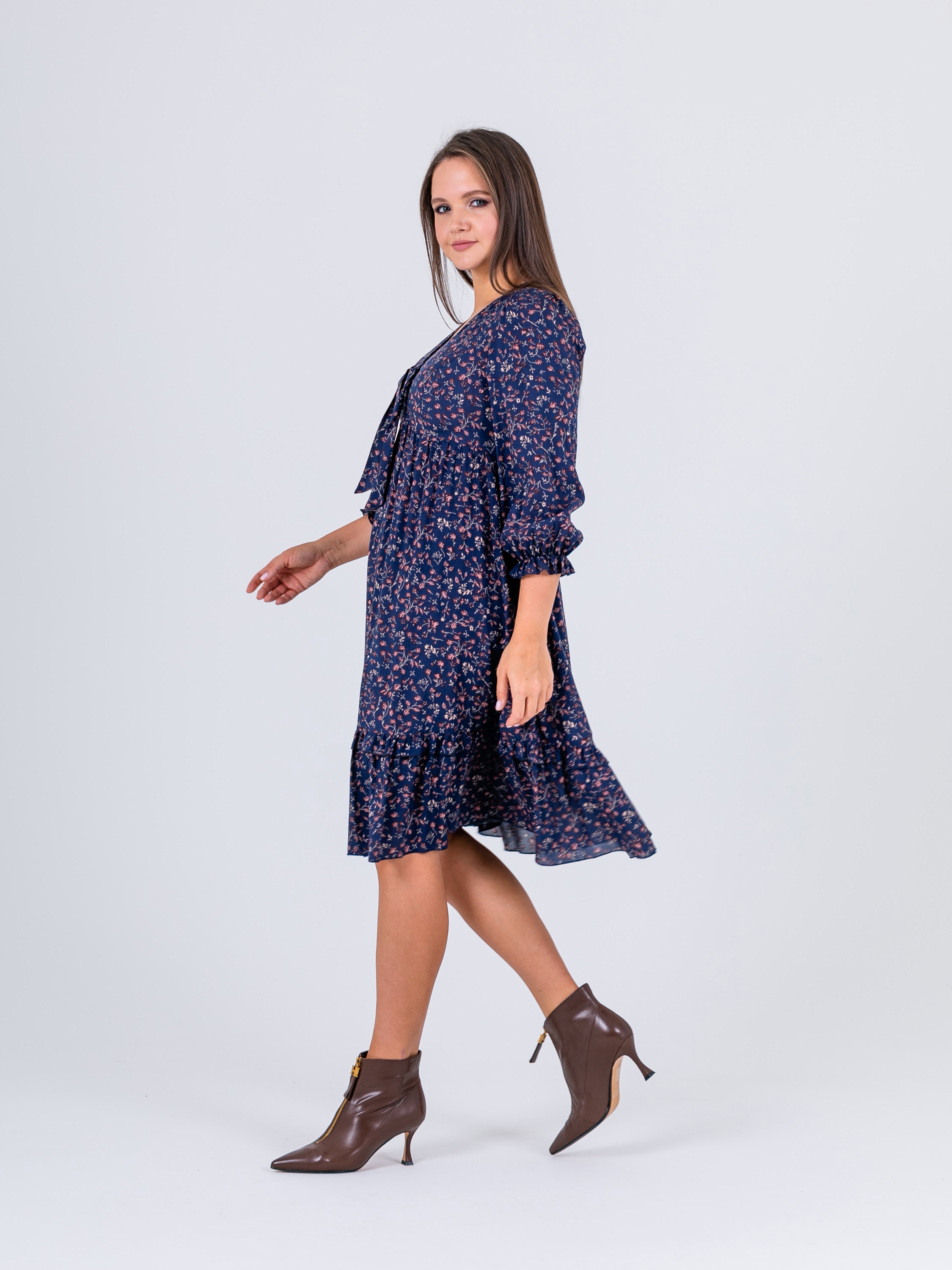 На сайте указаны российские размеры. Крой: платье свободного силуэта из гладкой вискозы в стиле бохо. Отрезное под грудью, расклешенное, имеет втачной рукав, низ которого собран на эластичную тесьму, что позволяет фиксировать его на комфортную высоту и разный объем рук. Платье состоит из двух ярусов, которые выгодное подчеркивают достоинства фигуры и изысканно маскируют недостатки. Платье подойдет женщинам разных фигур и комплекций, а в особенности будущим мамам и прекрасным обладательницам шикарных форм. Отделка: имеет тонкие завязки в области груди, которые можно повязать в узел или изысканный бант. Ткань в мелкий цветок создает женственный и романтичный образ, который влюбляет в себя с первого взгляда. Сочетайте с однотонными жакетами и кардиганами из ассортимента Stern.