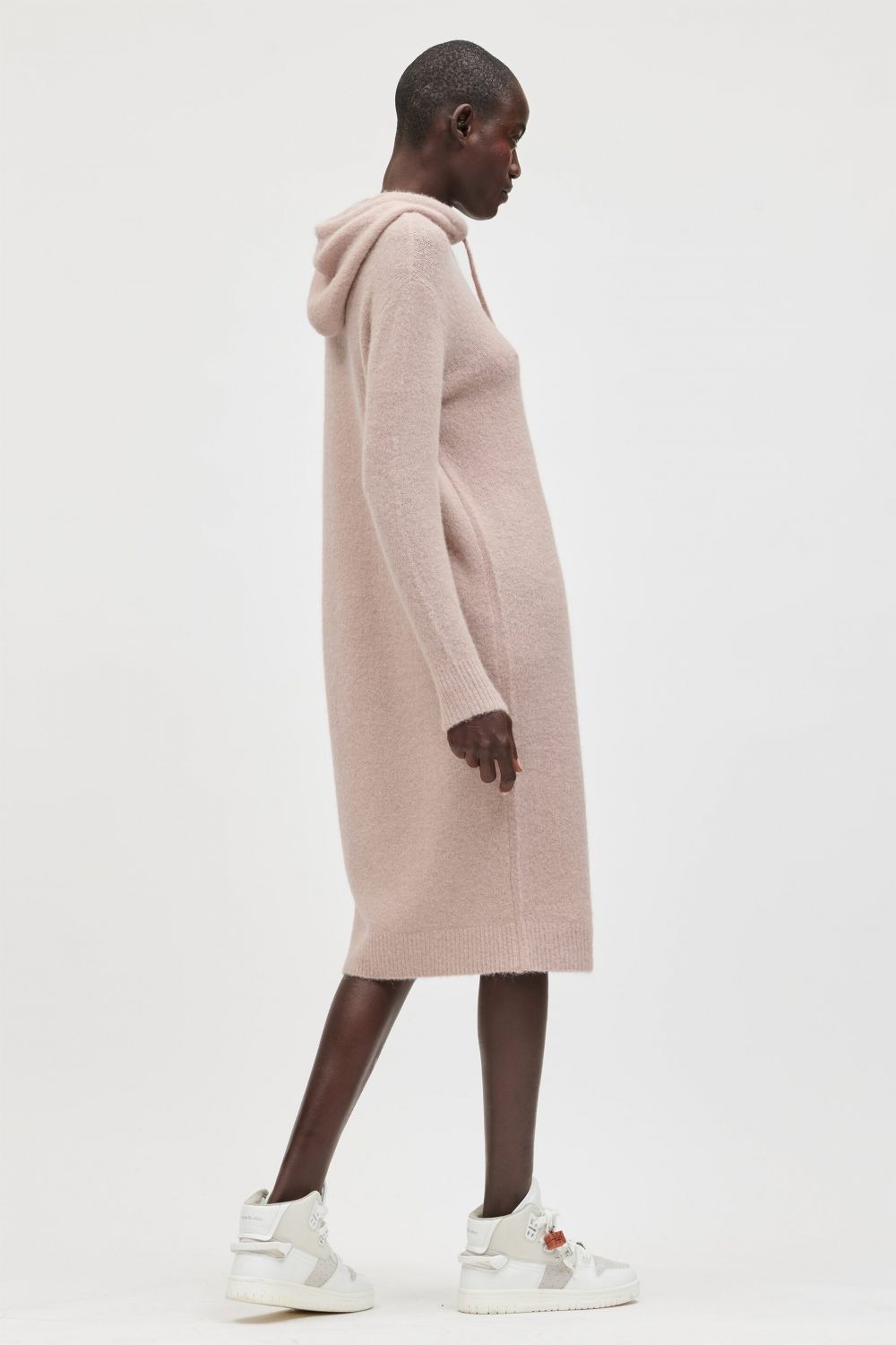 На сайте указаны российские размеры. Длинное платье прямого кроя из высококачественной итальянской смеси альпака с эластичной нитью и мелкими убавляющими деталями и деталями швов. Большой капюшон с кулиской сохраняет тепло и тепло. Рост модели 178 см.