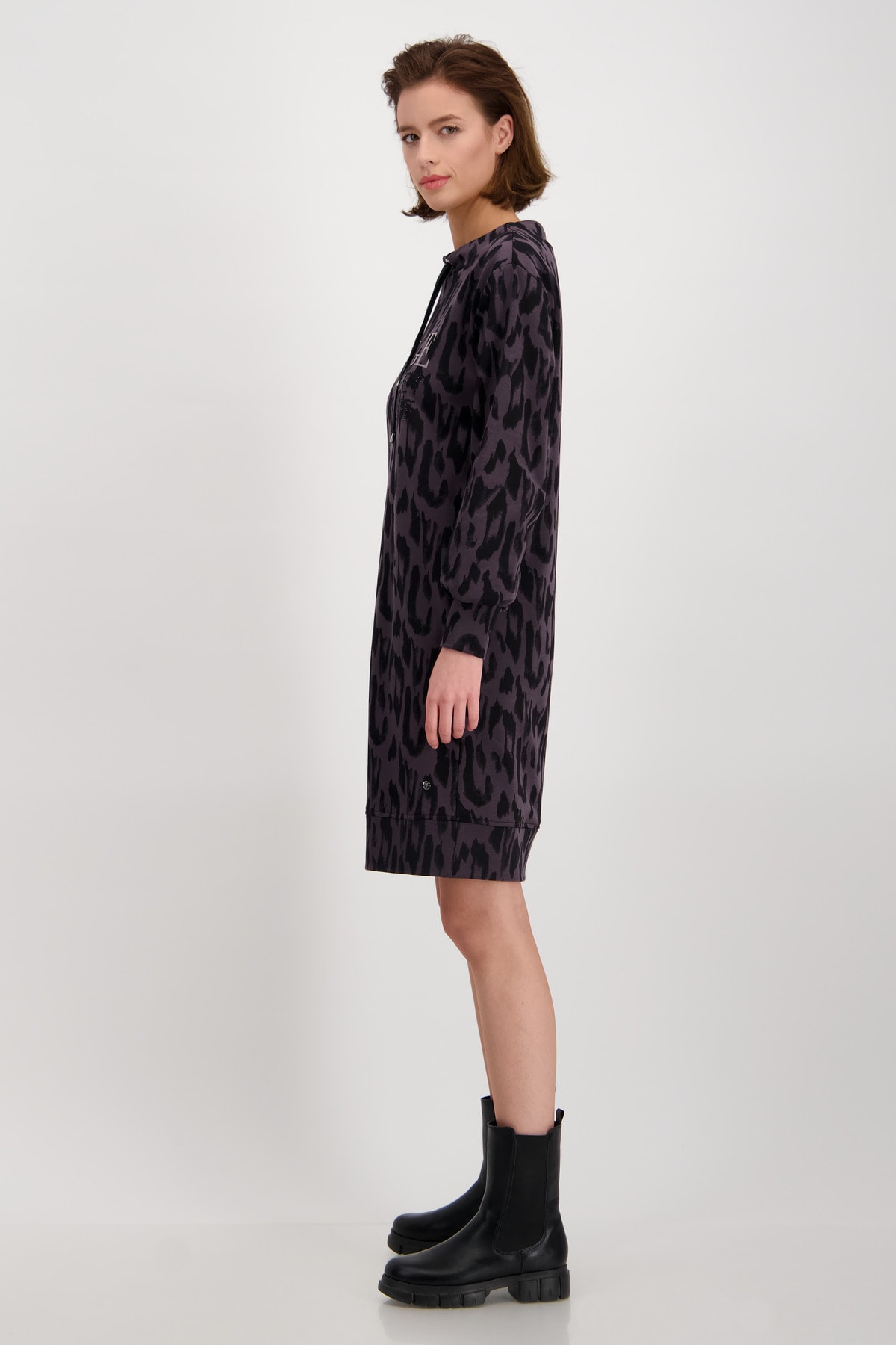 На сайте указаны российские размеры. Спортивное платье миди с воротником-стойкой и принтом по всей поверхности. Это изделие привлекает всеобщее внимание сплошным леопардовым принтом, а лицевая сторона украшена лакированными буквами и стразами, а также сверкающей эмблемой из страз. С воротником-стойкой на кулиске, люверсами и завязками, широкими манжетами с рюшами на концах рукавов и широкой манжетой по низу модель миди прямого кроя предстает с лучшей стороны. Карманы в боковых швах завершают стильный образ. Хлопок в смеси также обеспечивает отличный комфорт при ношении в течение дня. Модель ростом 178 см. Длина спины 44 размера составляет 96 см.