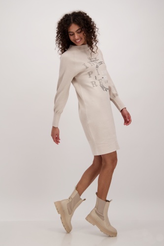 На сайте указаны российские размеры. Длинный прямой крой этого платья миди от monari идеально подчеркивает вашу фигуру. Платье с длинными рукавами реглан, вязаным воротником-стойкой и широкими манжетами с рюшами на концах рукавов можно носить и в прохладные дни. Модель комфортно лежит на коже благодаря обработке 100% чистого, качественного хлопка. Передняя часть украшена буквенной эмблемой из глиттера, стразов и лакового принта, а также сверкающей надписью из страз и небольшой блестящей объемной надписью. Всегда хороший выбор для вашего наряда! Модель ростом 176 см. Длина спины 44 размера составляет 94 см.