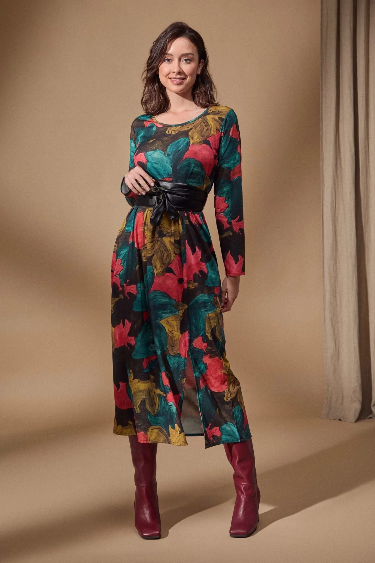 На сайте указаны российские размеры. Длинное платье с цветочным принтом и пышным и объемным низом. Ненавязчивый разрез спереди. Классические длинные рукава и широкий вырез воротника. Рост модели 170 см. Длина 124 см в размере 44.