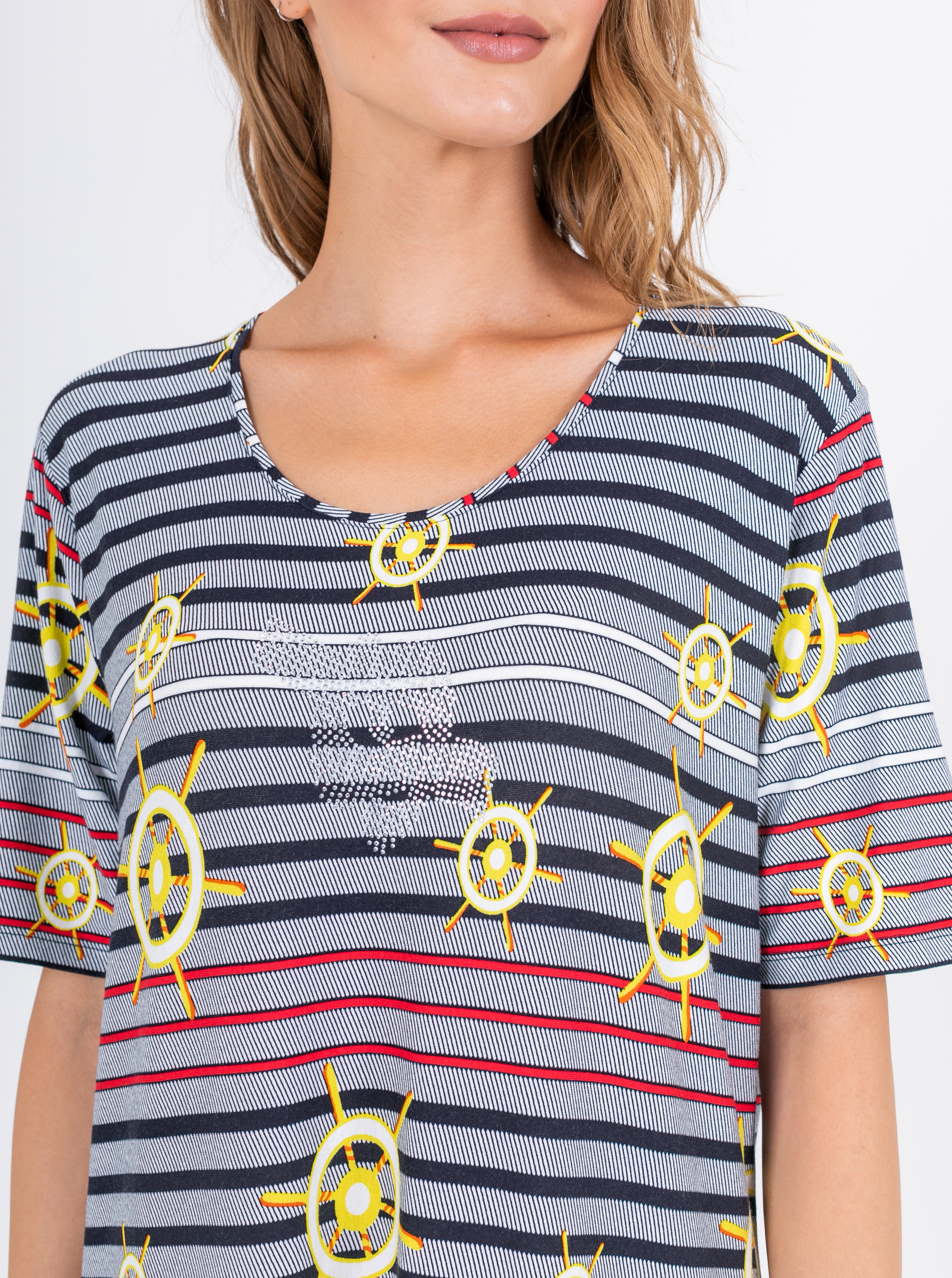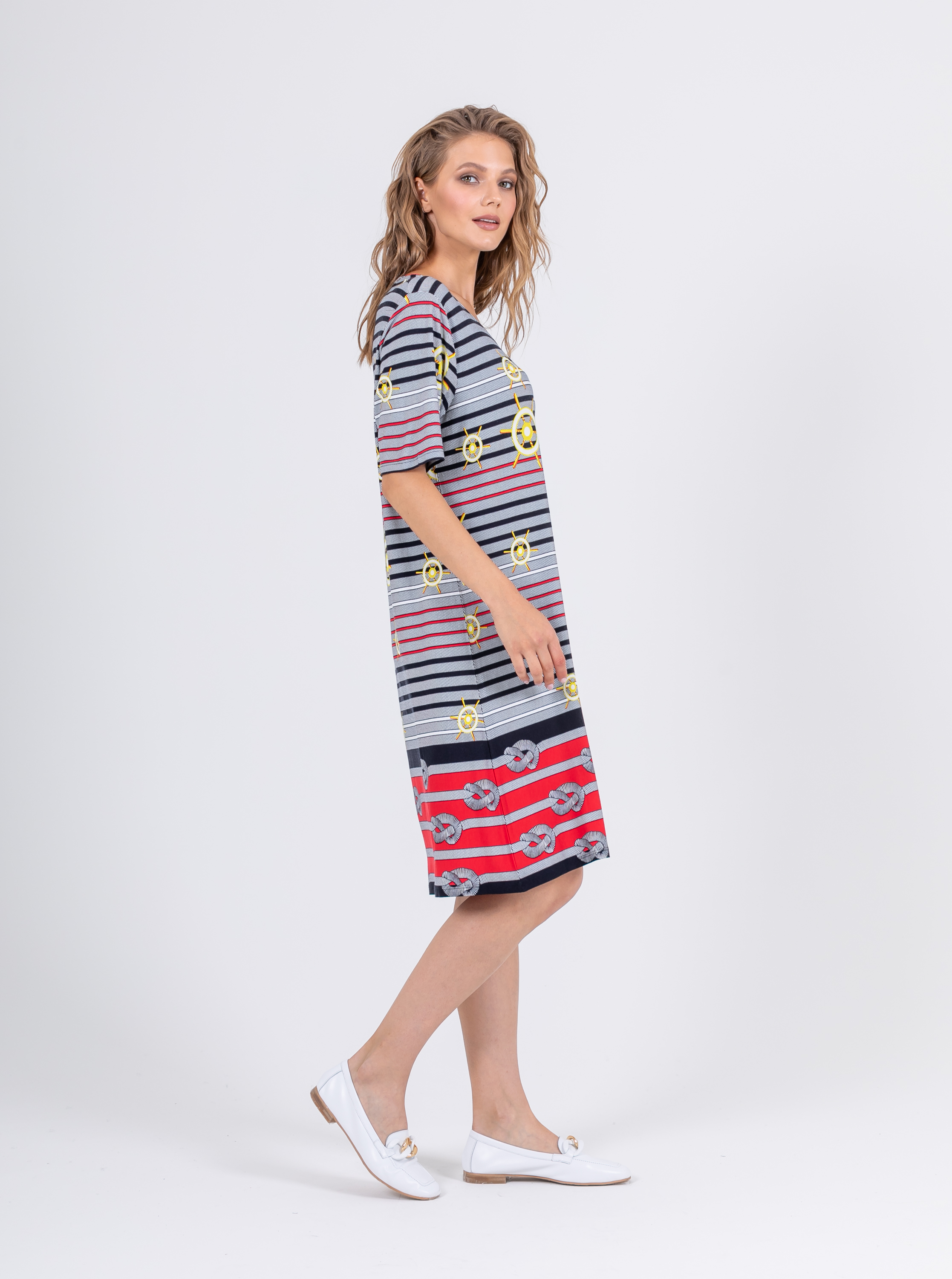 На сайте указаны российские размеры. Крой: платье прямого силуэта с коротким втачным рукавом и круглым вырезом – универсальная модель, подходящая под разные типы фигуры. Длина чуть ниже колена позволяет создать гармоничный женственный образ, в котором вы будете чувствовать себя достойно. Платье выполнено из приятной вискозы средней плотности – она прекрасно держит форму, но при этом не подчеркивает возможные нюансы фигуры. Отделка: полоски, штурвалы и канаты – ваше море всегда будет с вами. А чтобы усилить эффект, в зоне груди расположена аппликация из блестящих страз, повторяющих очертания морского узла из принта. Сочетайте платье с жакетами и мягким трикотажем из коллекции Stern.