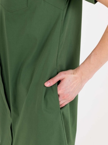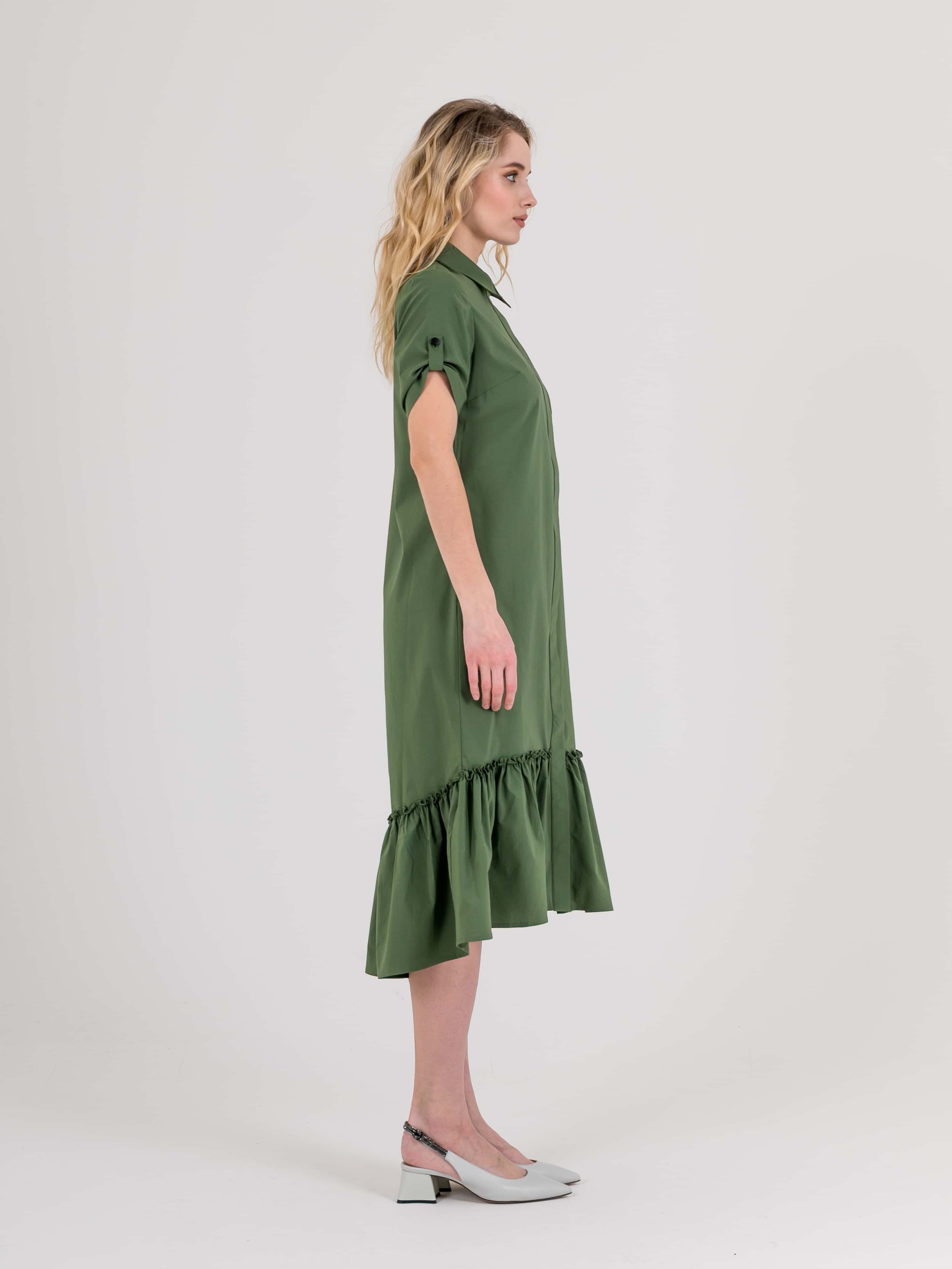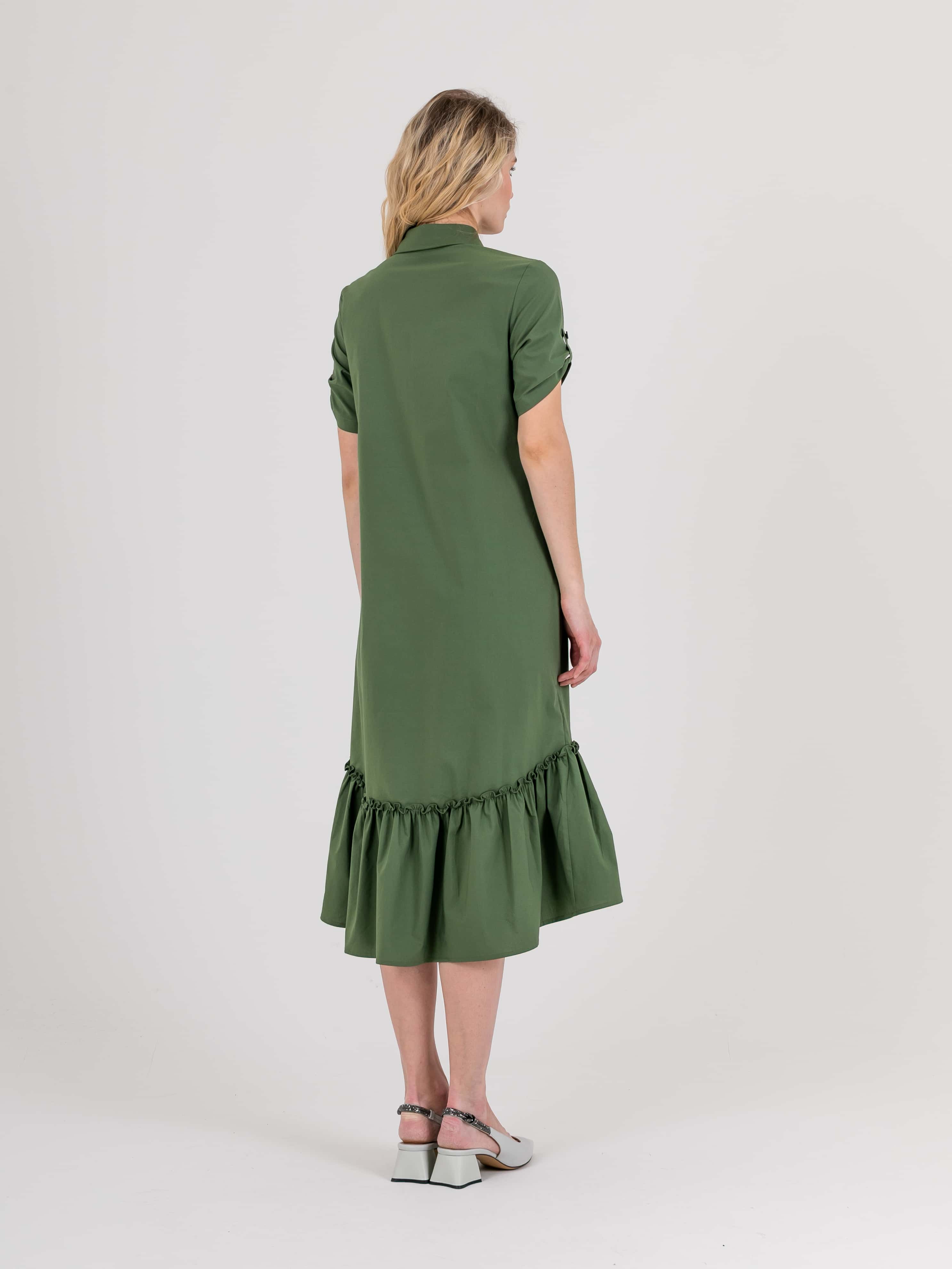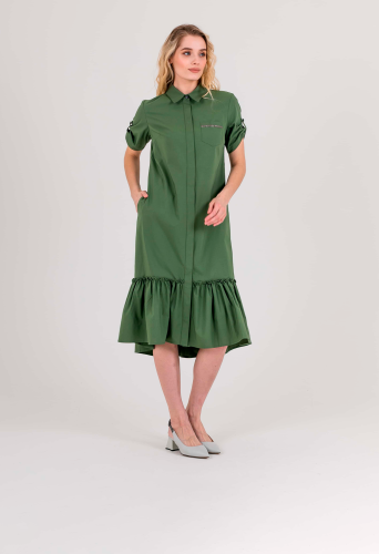 На сайте указаны российские размеры. Платье-рубашка А-силуэта длина миди с ассиметричной линией низа и оборкой. Перед с двумя вытачками на выпуклость груди, идущими из боковых швов и прорезными карманами. Застежка потайная на 10 пуговиц. Также в области груди располагается накладной карман с декоративной аппликацией из страз. Укороченные рукава с патами на пуговицах. Стояче-отложной воротник.