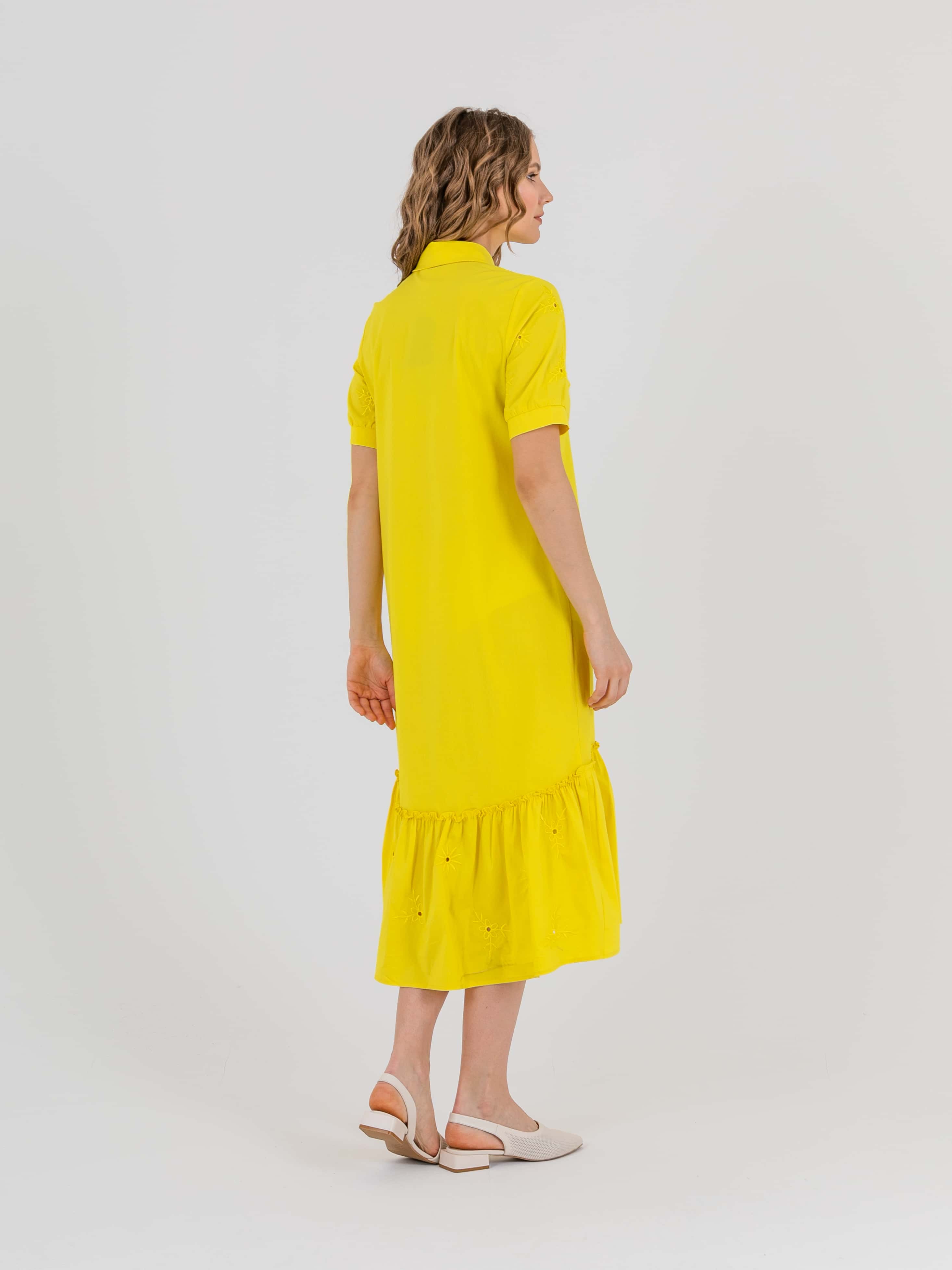 На сайте указаны российские размеры. Платье-рубашка А-силуэта длиной midi с оборкой по низу, дизайнерская особенность - потрясающее хлопковые шитьем растительного орнамента, есть съемный пояс. Перед с двумя вытачками на выпуклость груди, идущими из боковых швов. Застежка потайная на 10 пуговиц. Укороченные втачные рукава «фонарик» с манжетами. Стояче-отложной воротник.