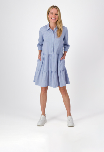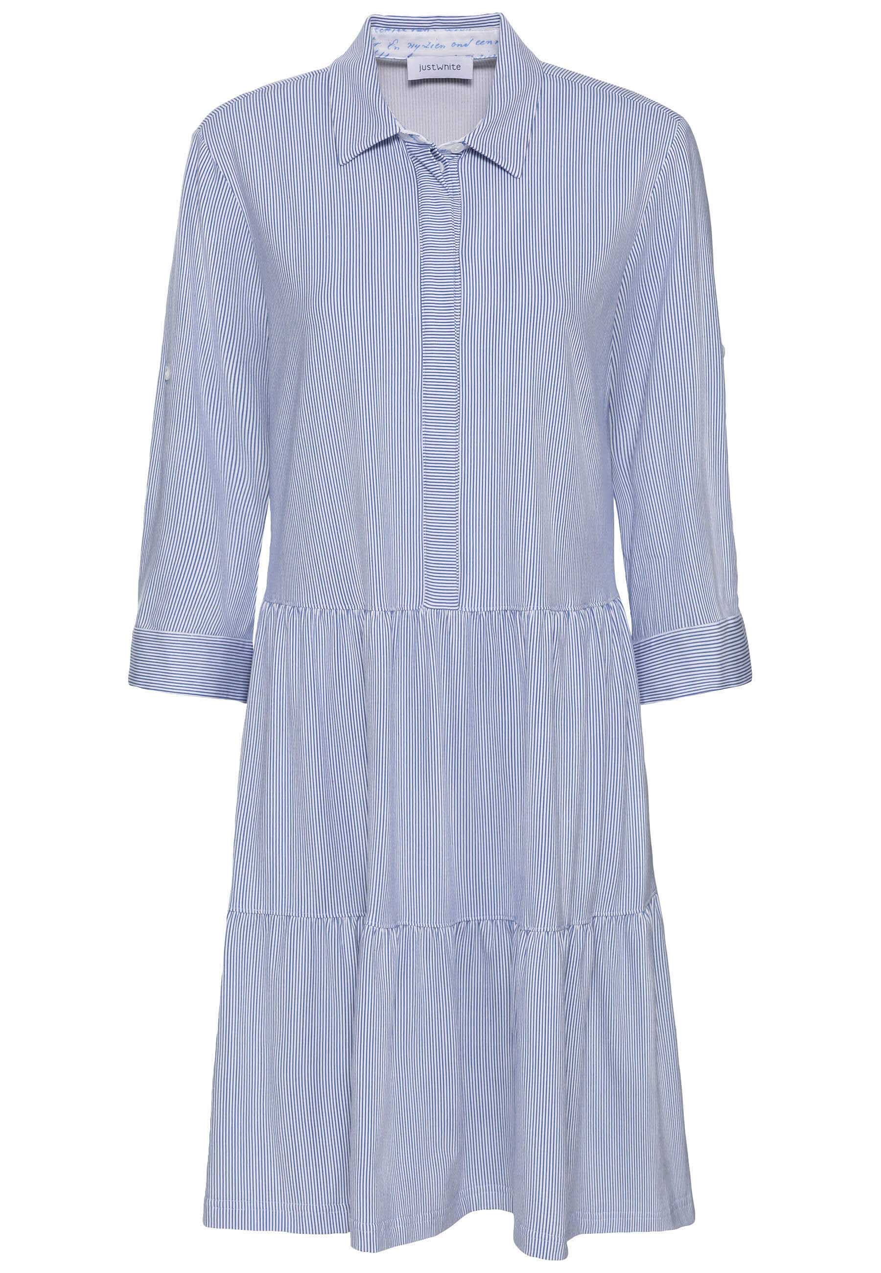 На сайте указаны российские размеры. Повседневное платье носит романтический характер благодаря двухъярусным оборкам, которые разбавляются сочетанием горизонтальных и вертикальных полосок и воротнику-стойке с планкой на потайных пуговицах. На воротнике и закатанных рукавах длиной 3/4 спрятан стильный буквенный принт — здесь внимание к деталям становится еще заметнее. Благодаря боковым карманам и прочному трикотажному материалу платье justWhite может стать вашим любимым летним платьем! Рост модели: 177 см.