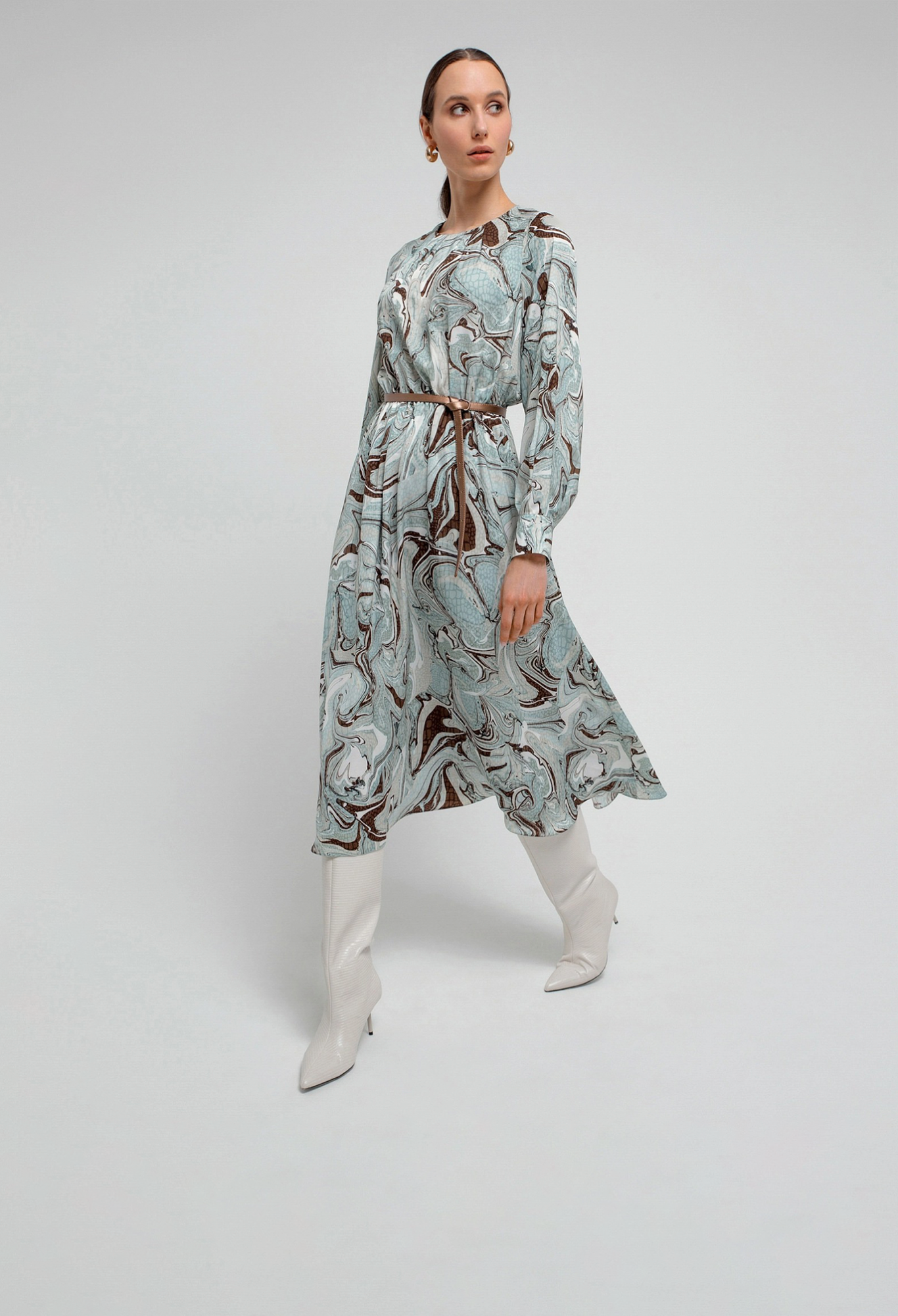 На сайте указаны российские размеры. Романтичное платье приталенного силуэта с втачным длинным рукавом на манжете. Выполнено из премиальной плательной ткани с модным абстрактным принтом. У платья круглая горловина, оформленная складками. В комплекте к платью идет тонкий пояс из экокожи. Длина изделия: 111 см. Рост модели 175 см.