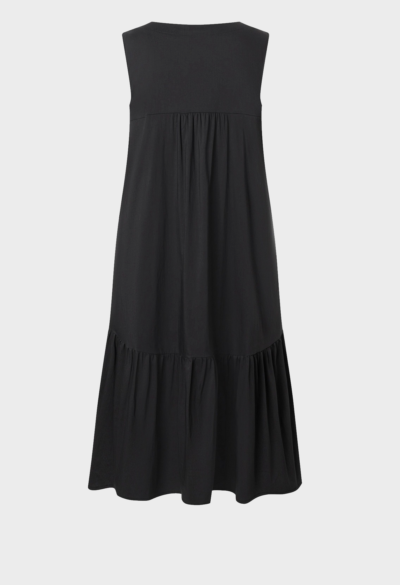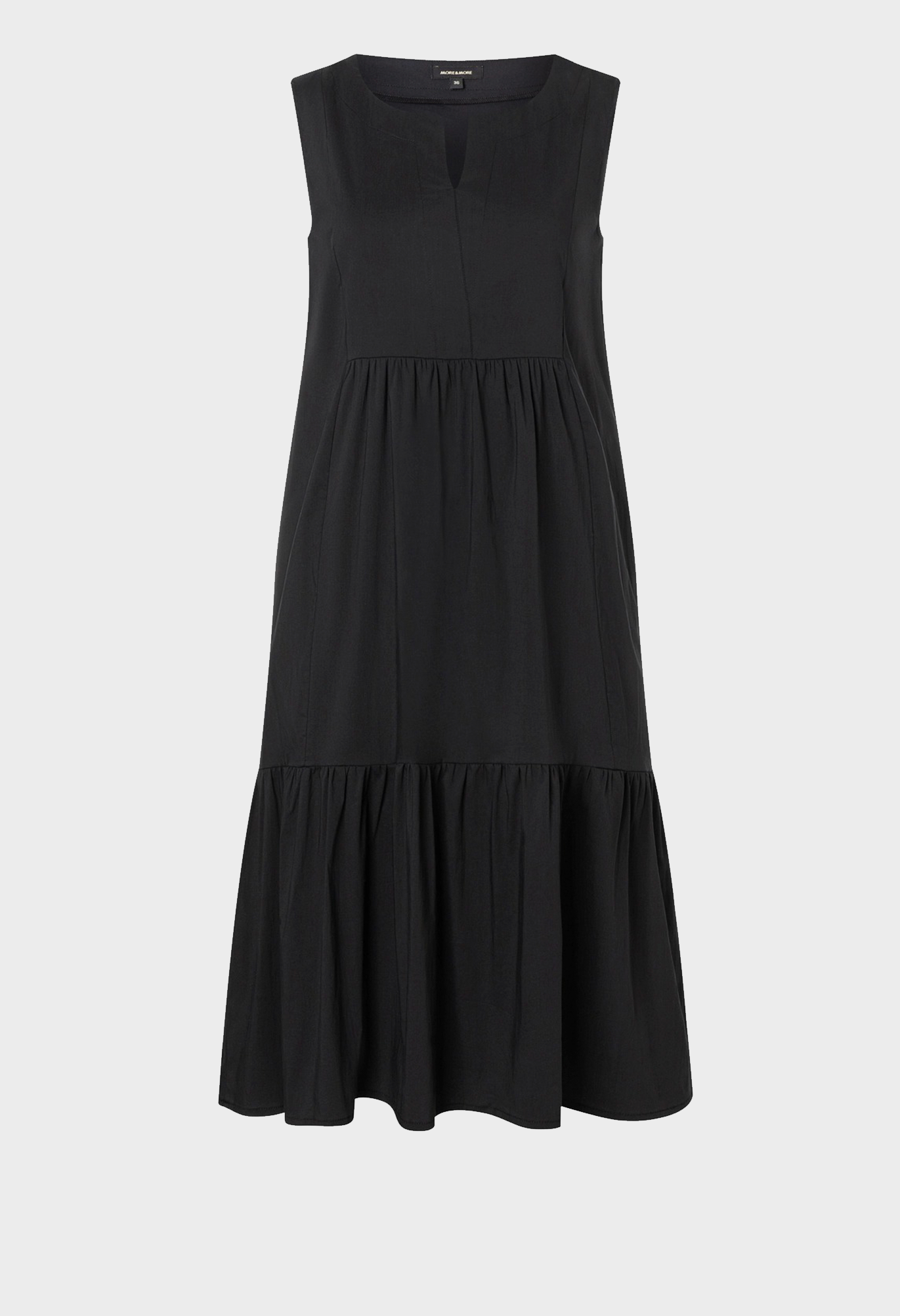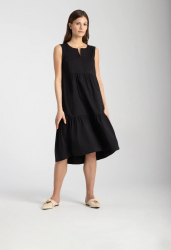Платье облегающего силуэта без рукавов с круглым вырезом с разрезом. Широкая оборка по нижнему краю. Длина миди. Без подкладки Длина в размере 42 - 96см