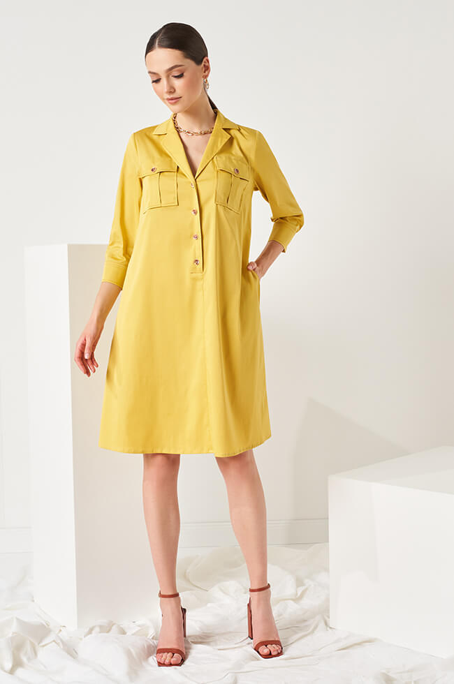 Платье-рубашка свободного силуэта с V-образным вырезом горловины с отложным воротником и лацканами. Центральная застежка на контрастные пуговицы. Рукава ¾, сосборены на манжету с разрезом и застежкой на контрастные пуговицы. Спереди нагрудные накладные карманы с клапанами. В боковых швах выполнены потайные карманы. Спинка с кокеткой. Дополняется контрастным поясом-лентой с прямоугольными пряжками.