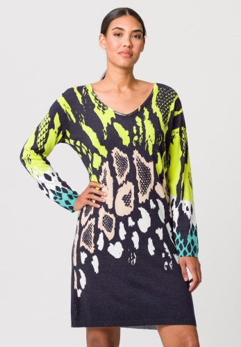 Трикотажное платье для женщин с широким V-образным вырезом и закатанным подолом. Мягкий и уютный тонкий трикотаж украшен таким выразительным и сочетающимся по цвету животным принтом. Кроме того, широкий V-образный вырез подчеркивает женственное декольте.