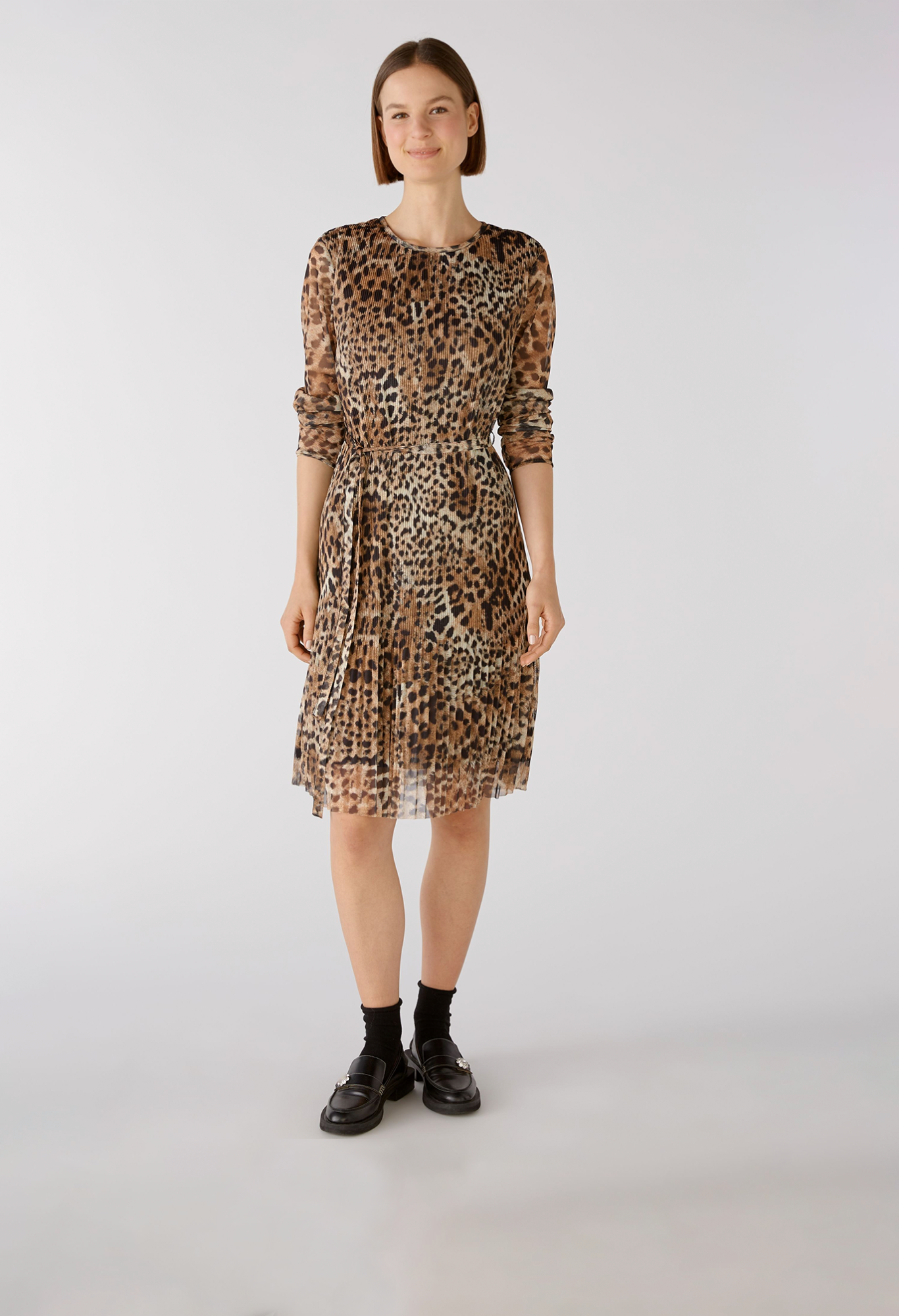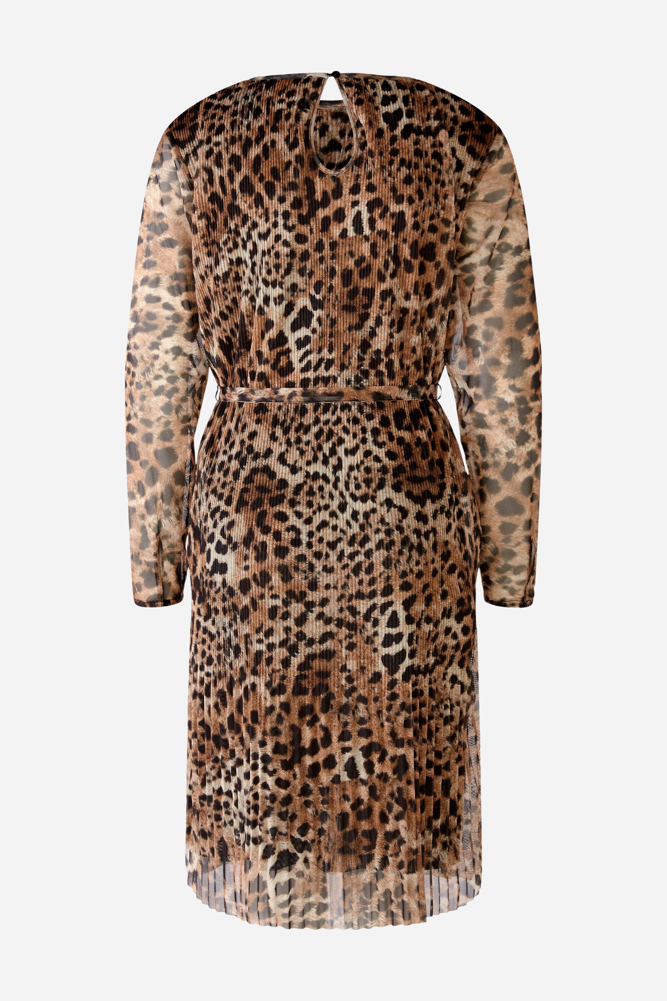 Платье длиной до колена с подчеркивающими фигуру сетчатыми складками. Плиссированная сетчатая ткань с натуралистичным леопардовым узором по всей поверхности. Длина до колена, прямой крой, свободная ширина юбки благодаря более широким складкам. Закрывается на небольшую кнопку сзади. Тело на подкладке, рукава без подкладки. Можно носить с поясом или расстегнуть как свободное платье. Длина для размера 42: 100 см.
