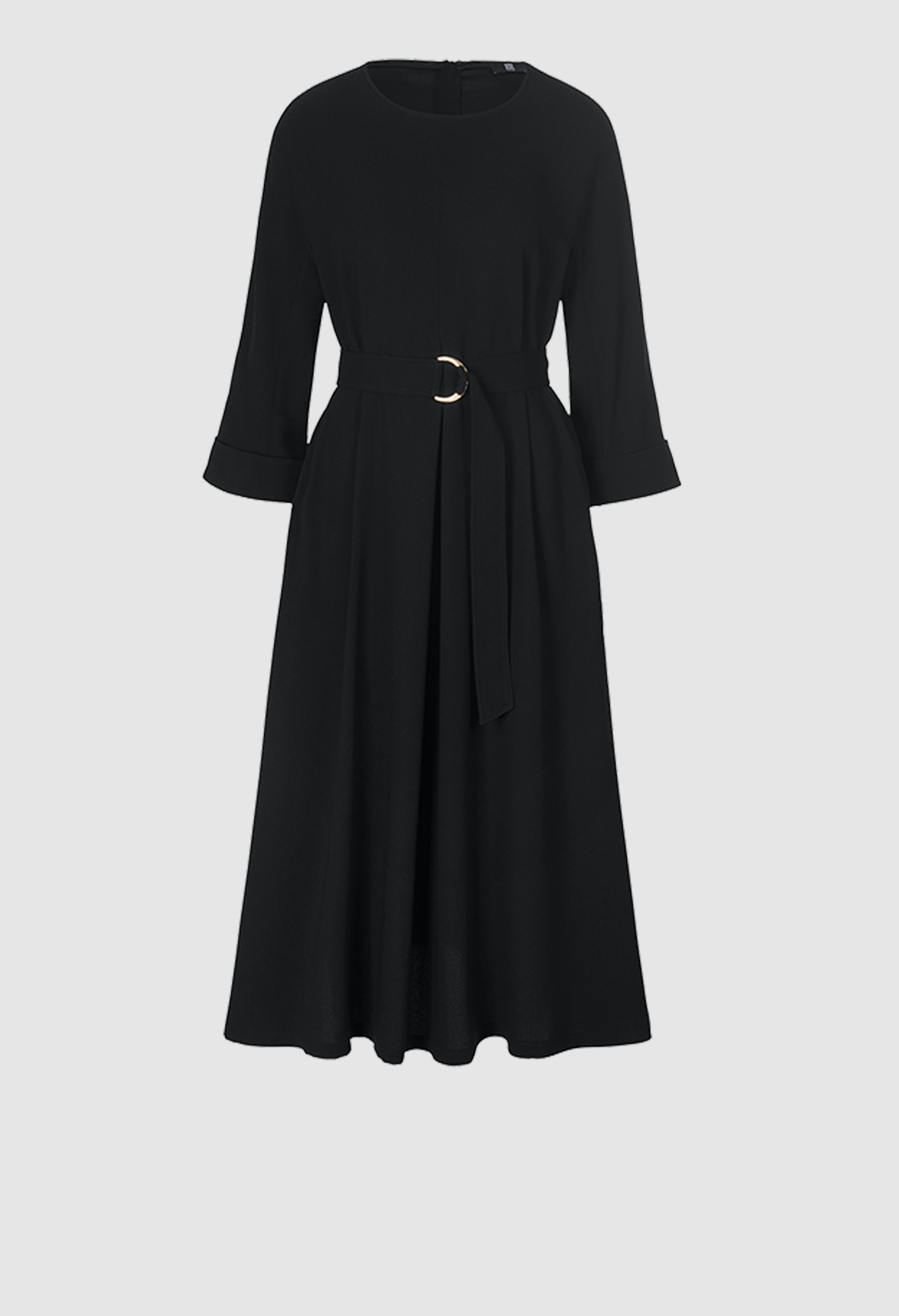 Платье миди из техно-атласа будет стильно и элегантно сопровождать свою обладательницу в течение всего дня. Небольшие акценты, такие как слегка раструбные рукава длиной три четверти, тканевый пояс с красивым металлическим элементом и струящаяся юбка, расставляют акценты.