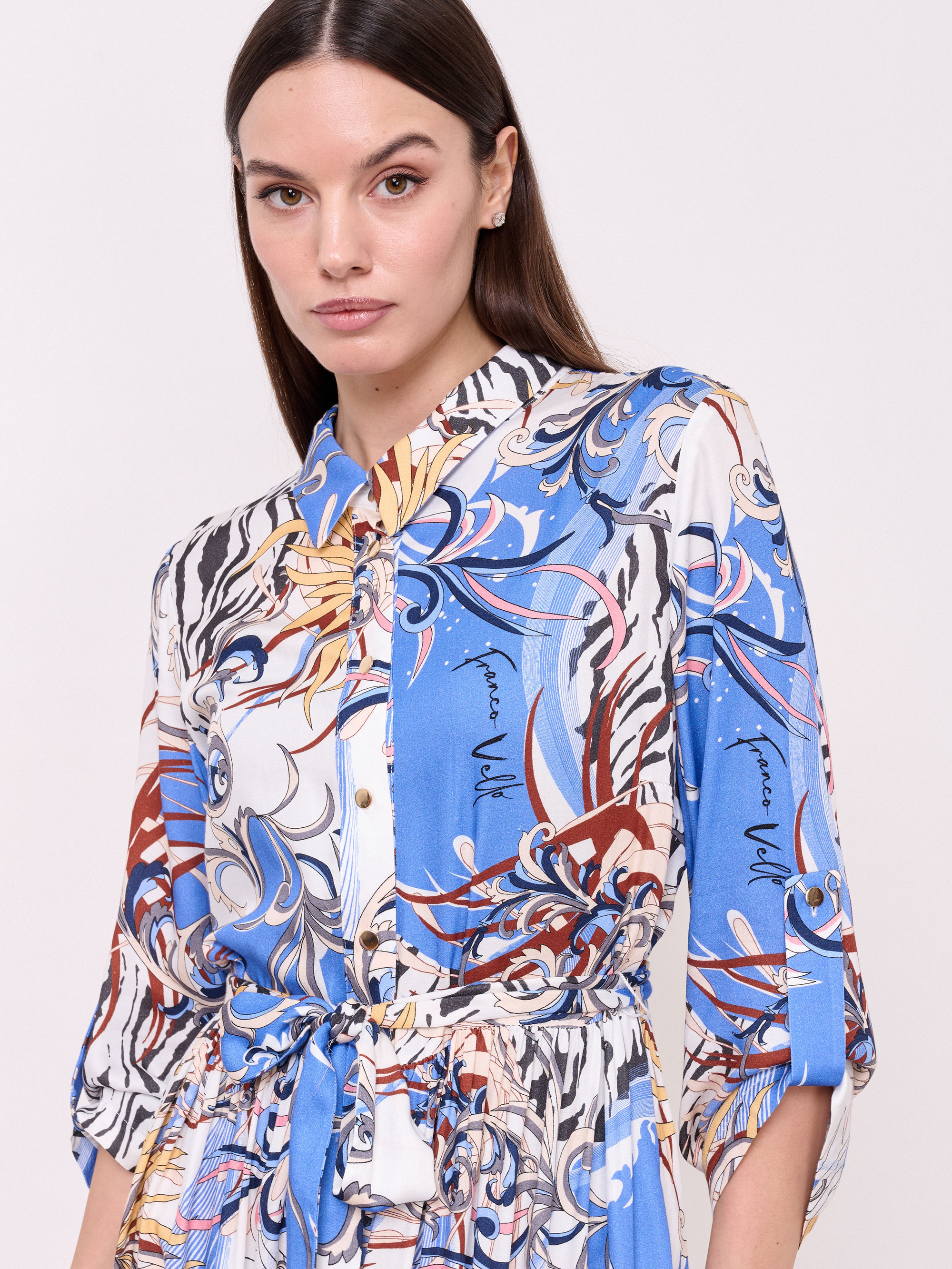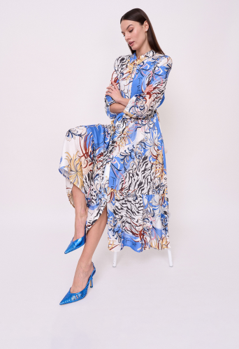 Визкозная ткань, застежка пуговицы, вырез горловины отложной воротничок, рукава 7/8 с хлястиками на пуговице, покрой рубашечный, рисунок орнамент, карманы в шве, конструктивные элементы воланы, длина платья макси, пояс из основной ткани. Длина по спинке: 126 см.