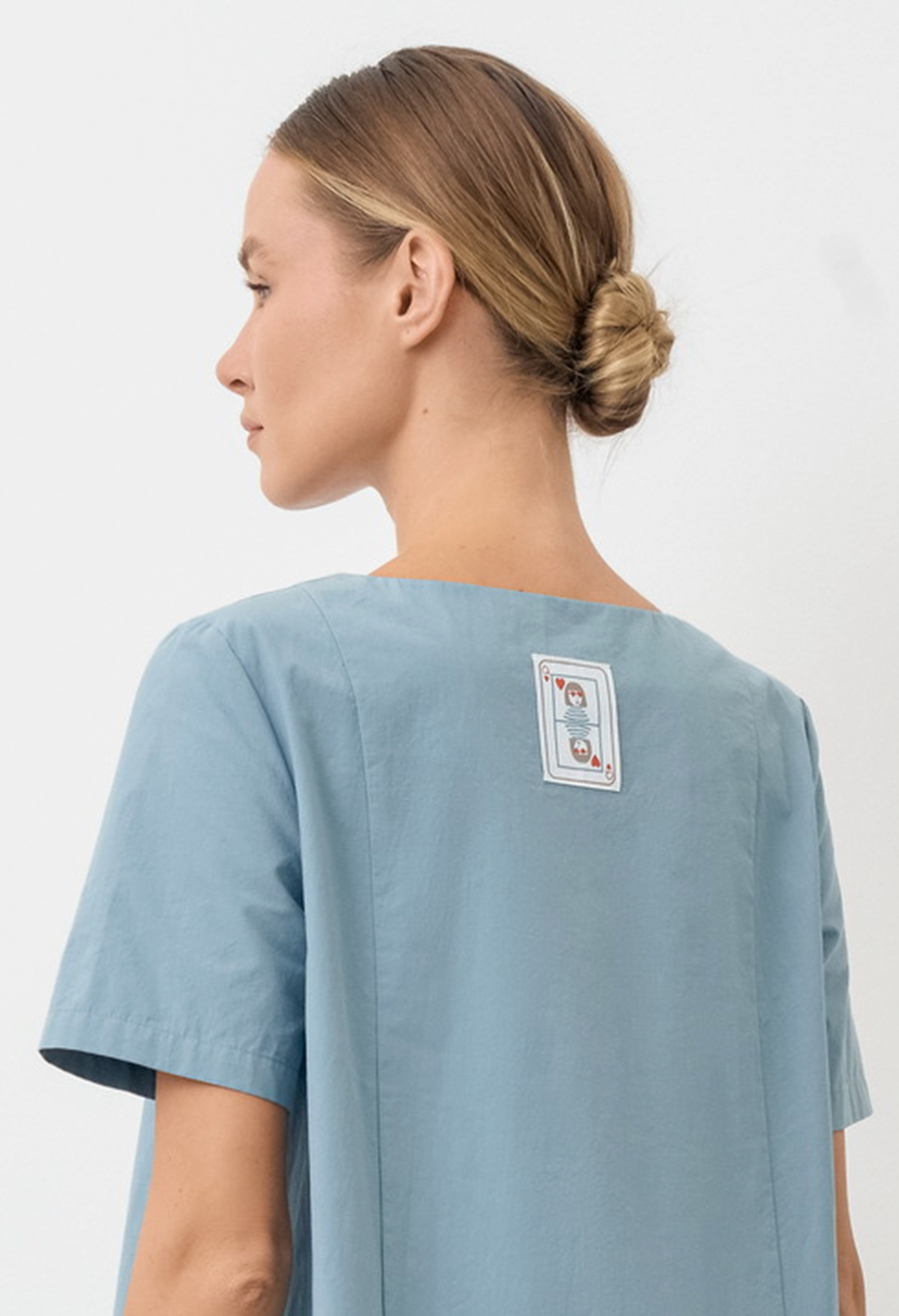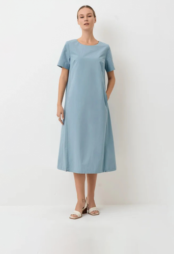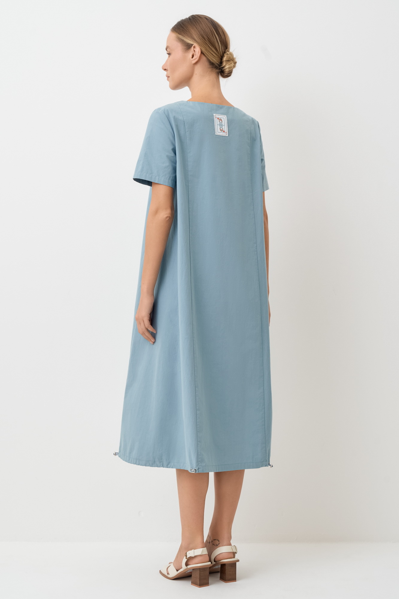 Платье О-образного силуэта свободное. Горловина-лодочка. По полочке от проймы вертикальный шов, в котором карман. По спинке два вертикальных шва, вверху по центру спинки декоративная настрочная деталь. Низ платья обработан вподгибку, с закрытым срезом и служит кулисой, которая регулируется резинкой с фиксаторами.