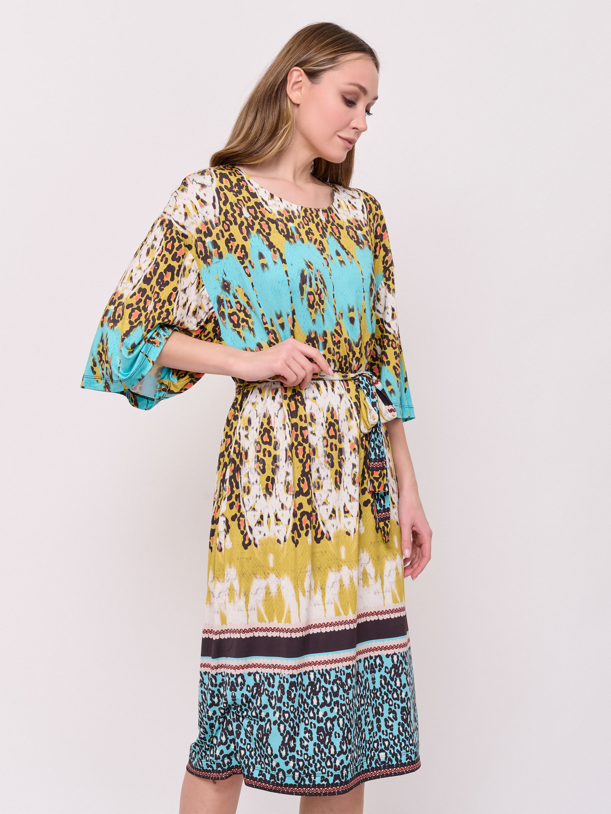 Детали: без застежки, вырез горловины округлый, рукава 3/4, покрой прямой, рисунок орнамент, без карманов, конструктивные элементы пояс, длина платья миди, нижний слой. Длина по спинке: 115 см.