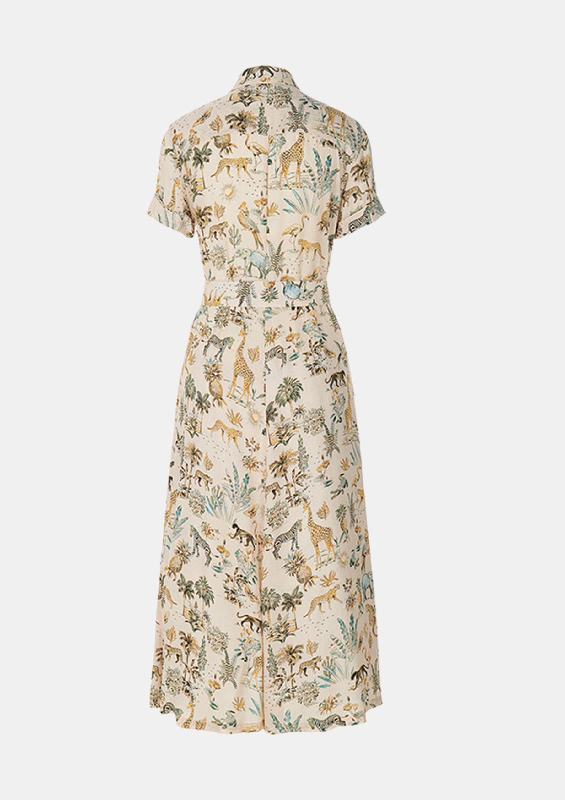 Платье-рубашка модной длины миди с короткими рукавами, поясом и расклешенным силуэтом. Настоящая классика моды, представленная здесь в эксклюзивном принте Safarino на чистой вискозе.