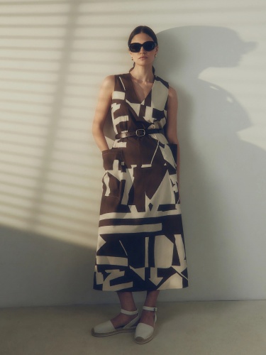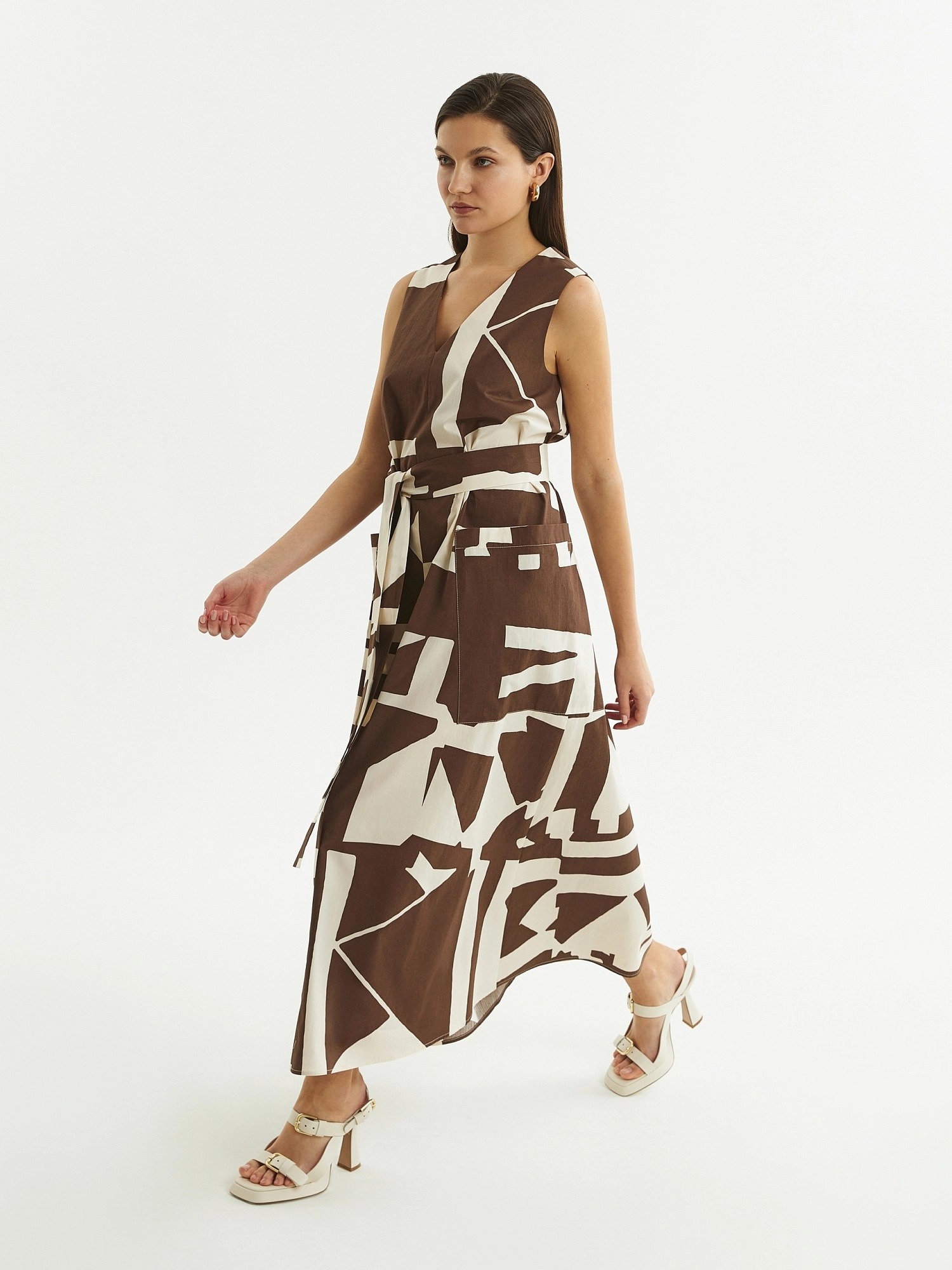 Стильное платье без рукавов из хлопковой ткани свободного А-силуэта длины миди с V-образным вырезом горловины и крупными накладными карманами. В комплект входит съемный пояс из ткани для создания более приталенного силуэта.
