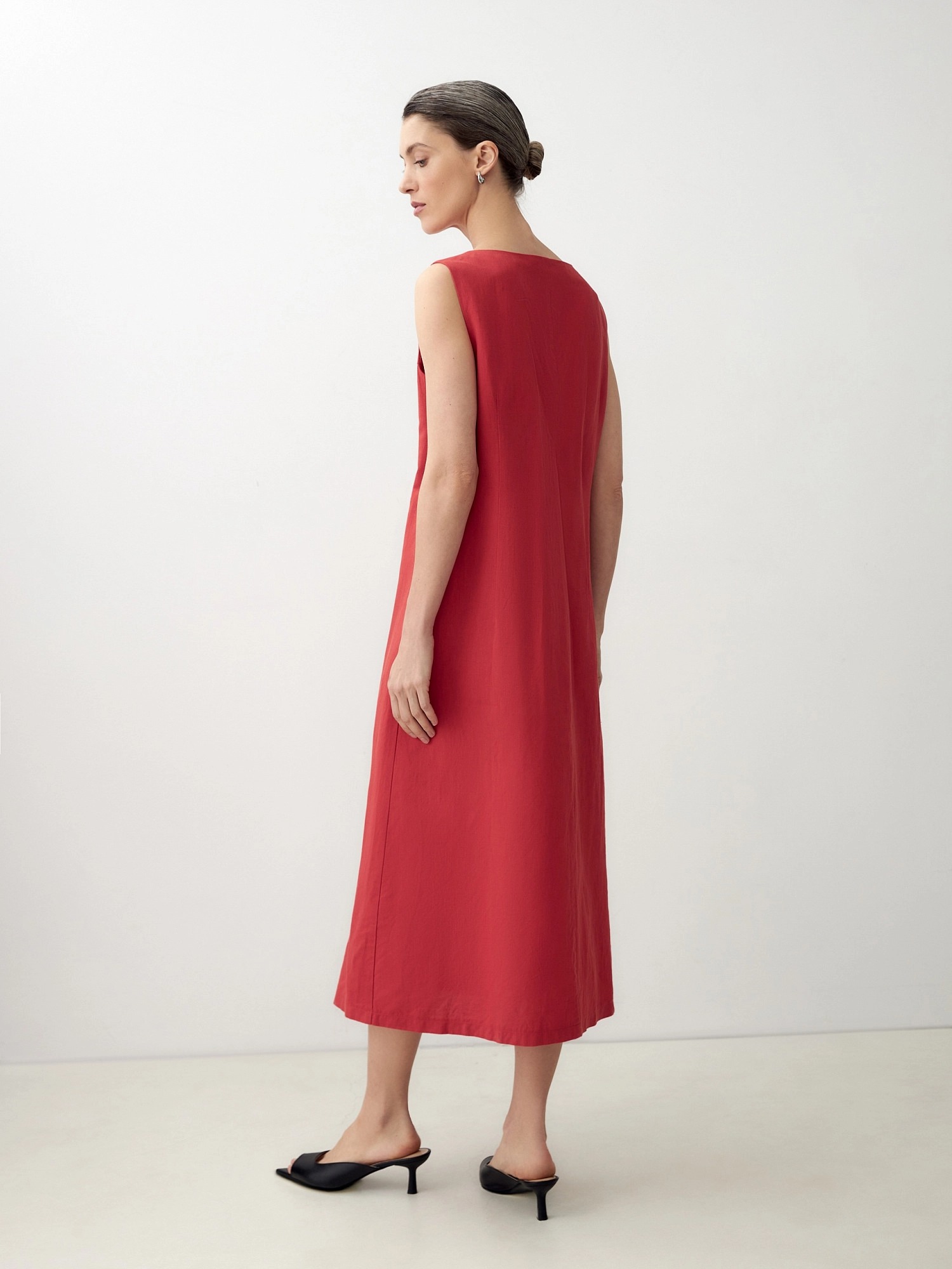 Платье трапеция из льняной ткани с круглой горловиной и небольшим разрезом по переду. В боковых швах потайные карманы.
