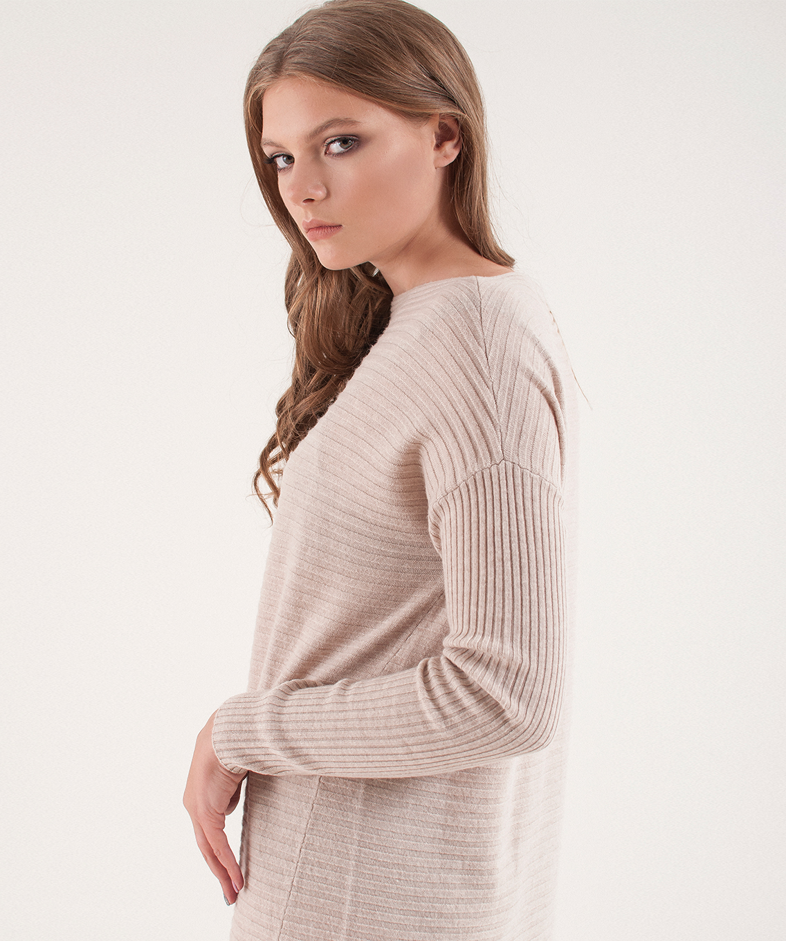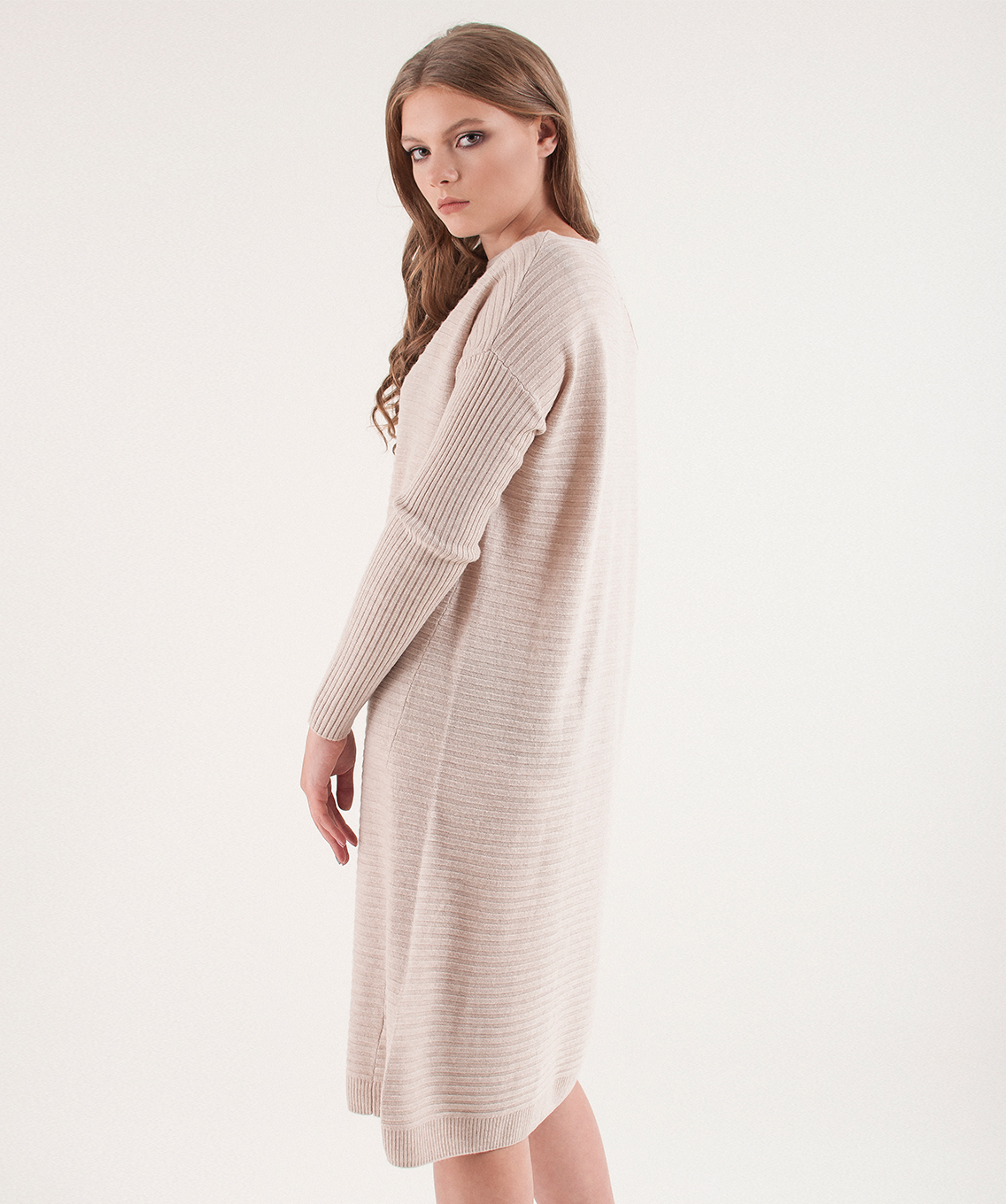 Однотонное трикотажное платье в рубчик. Актуальная длина миди.Свободный силуэт подходит для любого типа фигуры. Вырез горловины лодочка выгодно подчеркивает линию шеи. Спущенная линия плеч делает образ расслабленным. Платье хорошо сочетается с высокими сапогами.