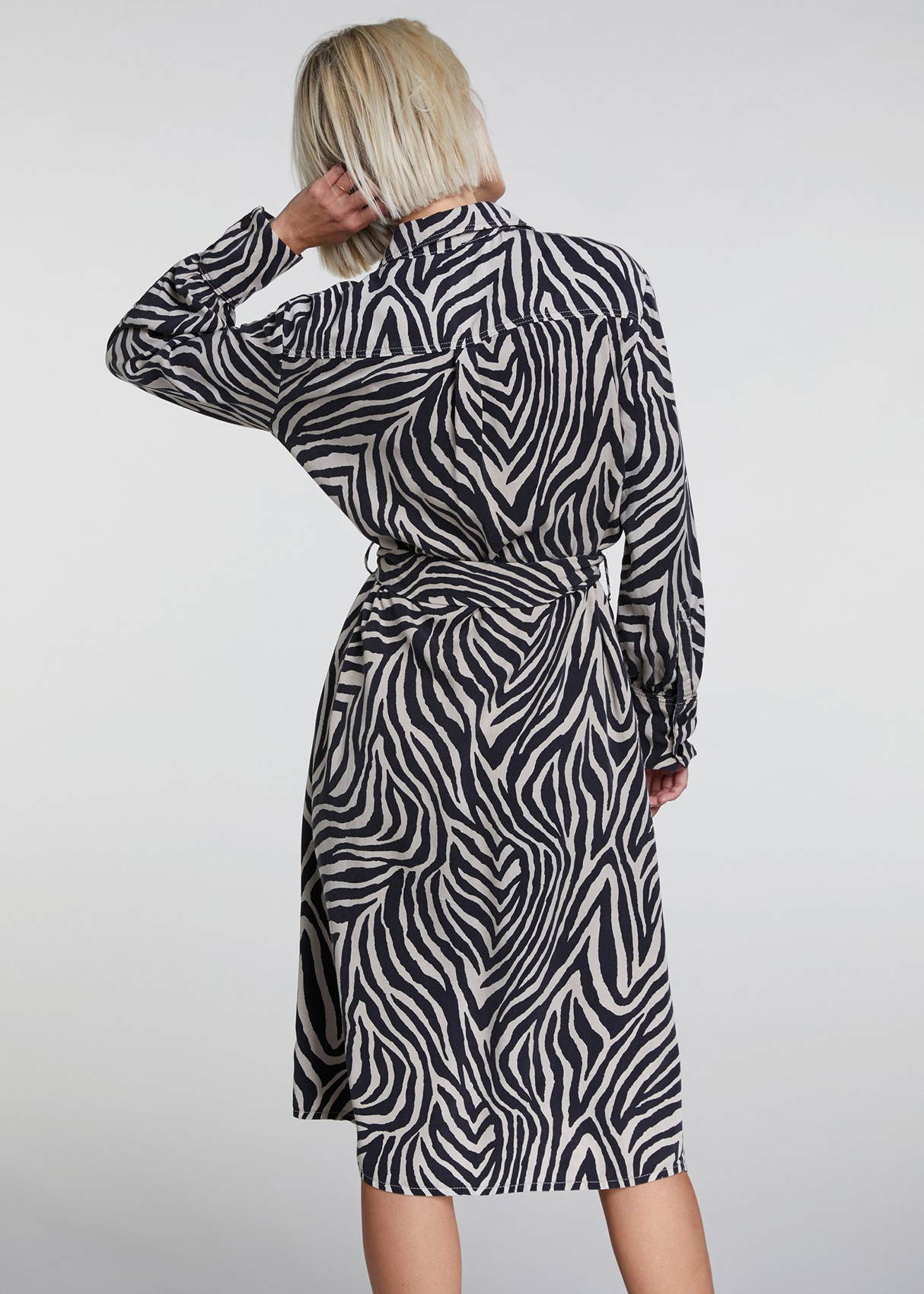 Платье миди в анималистичной расцветке. Отложной рубашечный воротник, планка с пуговицами. Благодаря тканевому поясу можно сделать силуэт приталенным. Втачной рукав полной длины с манжетой.