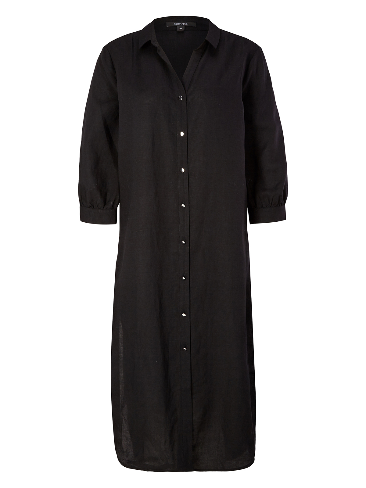 Однотонное платье-рубашка прямого кроя. Закругленый срез, удлиненная спинка. Рубашечный отложной воротник, планка с пуговицами. Втачной рукав 3/4 с манжетом.