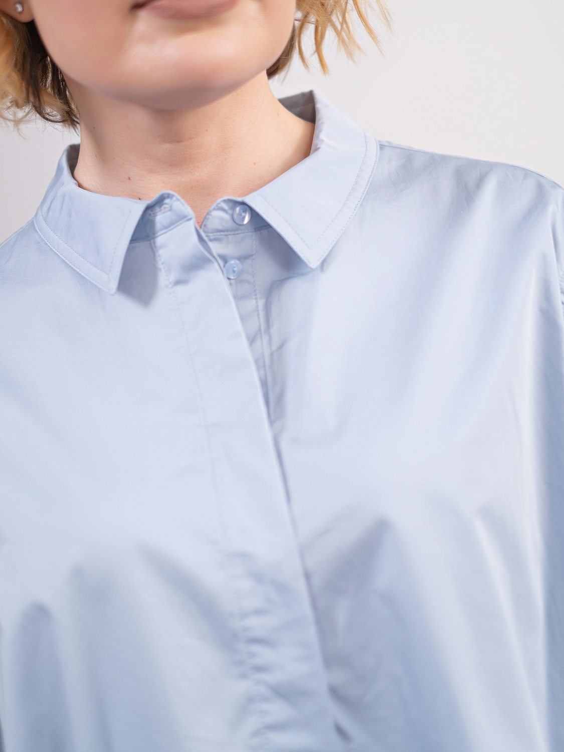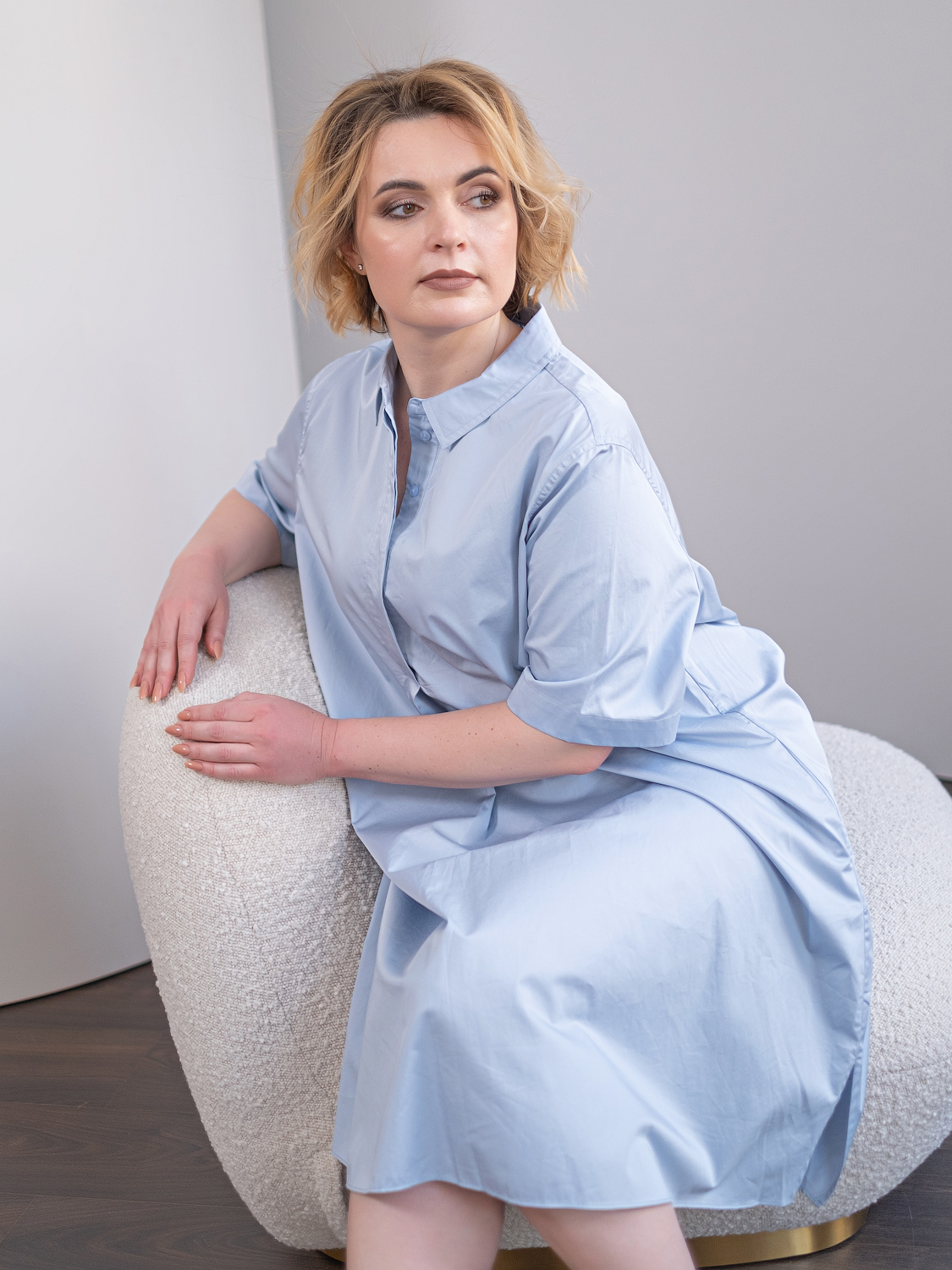 Хлопковое платье-рубашка свободного кроя. Длина миди. Отложной рубашечный воротник. Короткий втачной рукав с отворотом. Застежка на пуговицы.