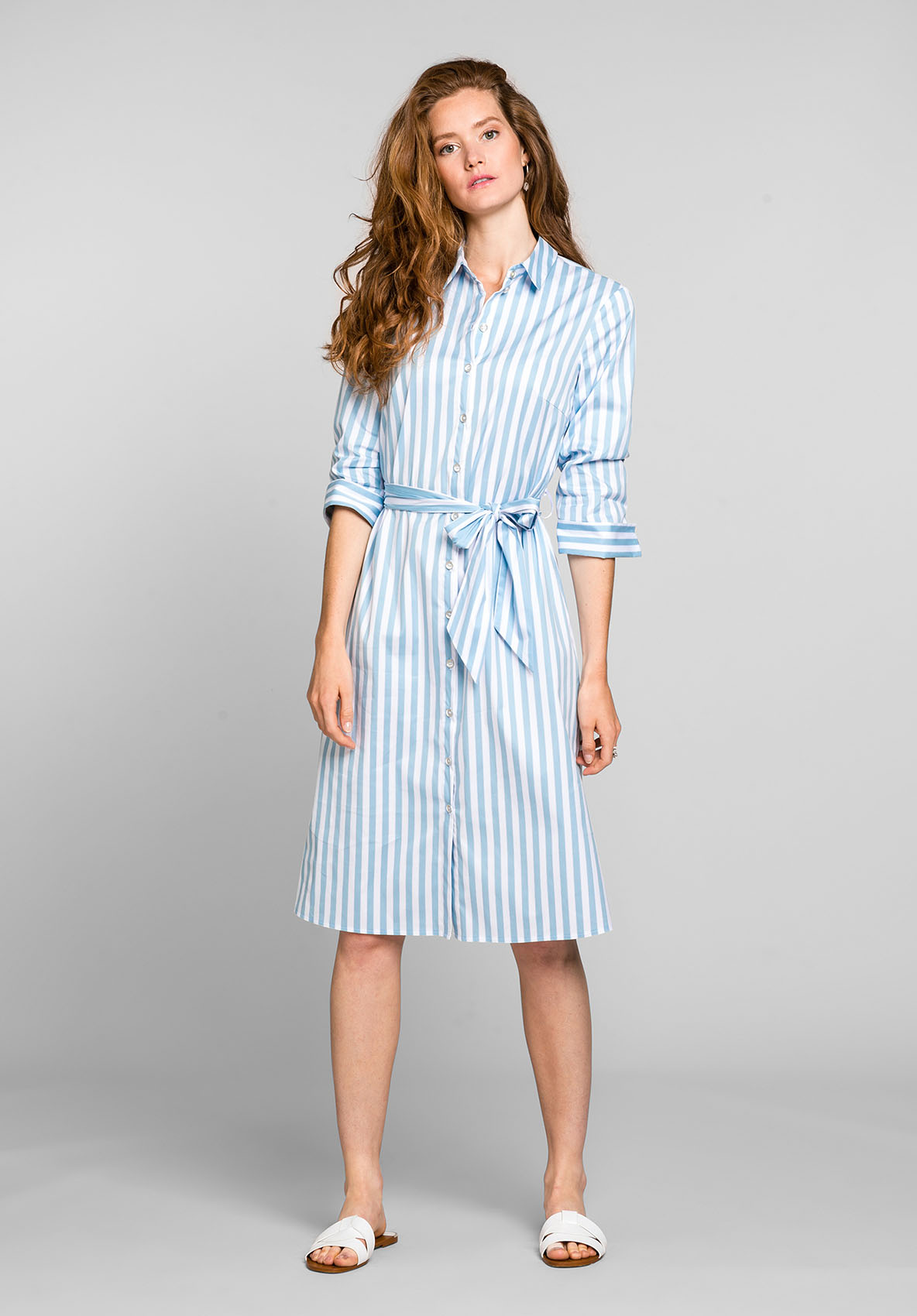 Современное и всегда актуальное. Повседневное платье-рубашка Dilana из приятной хлопково-эластановой ткани в полоску - абсолютный модный универсал. Современный дизайн с рубашечным воротником, непрерывной пуговичной планкой и рукавом 3/4. Галстук-пояс на талии подчеркивает достоинства фигуры. Платье в полоску - универсальный предмет гардероба, его можно носить даже с кроссовками. Платье выглядит благородно как с кожаной, так и с джинсовой курткой. • платье-рубашка • планка с пуговицами • пояс • смесь хлопка с эластаном • рубашечный воротник, рукава 3/4, прямой крой • длина юбки около 68 см; рост модели около 180 см • при росте 168 см платье будет закрывать колени