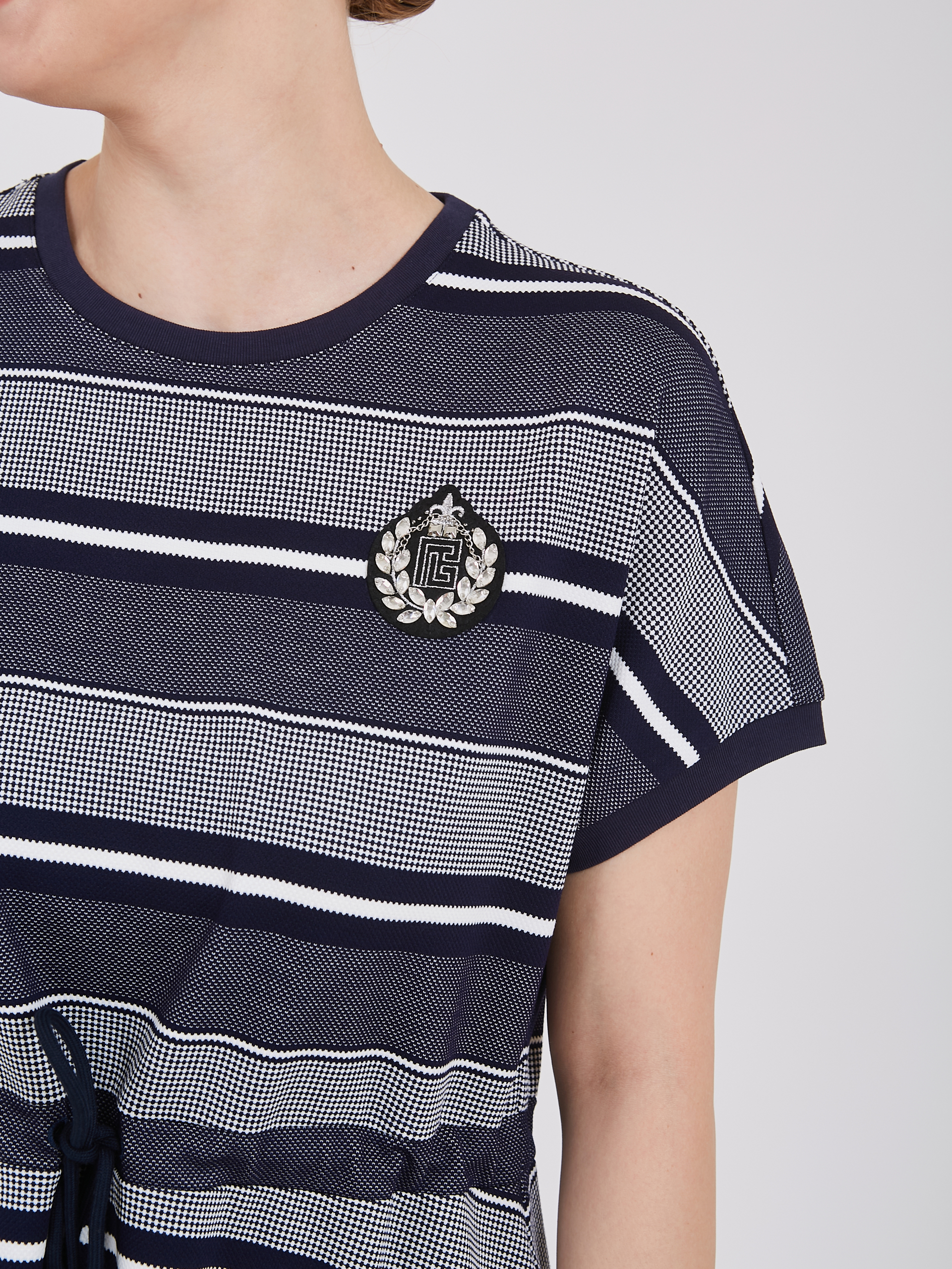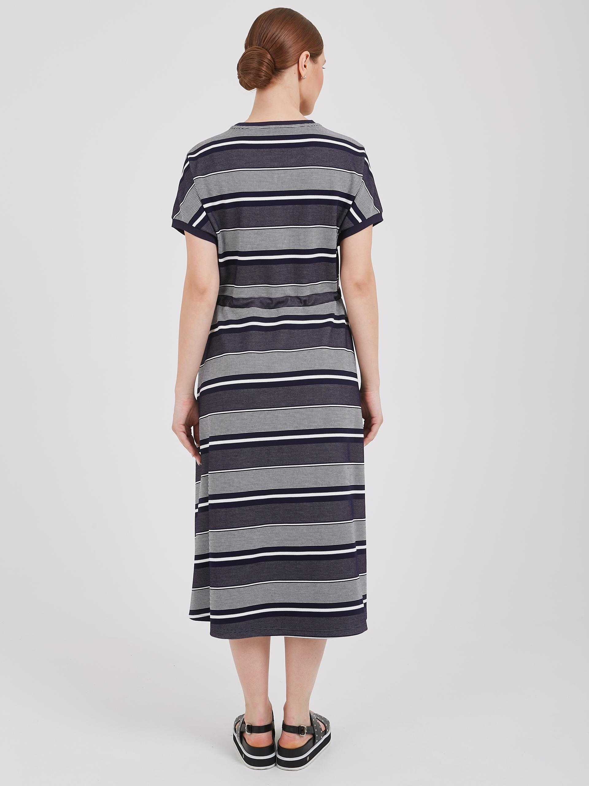 Платье имеет свободный крой с короткими рукавами и яркий полосатый рисунок в темных тонах, создающий стильный и комфортный образ. Дополнено декоративной брошью на груди и карманами, оно идеально подходит для повседневной носки. Коллекция Весна-Лето 2025. Капсула "Самарканд". Параметры модели: 95-64-101, рост 175, размер 44-46