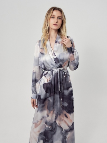 Свободное платье макси из атласной ткани в романтичном принте, по плечам складки, горловина с V-образным вырезом на запах. По переду есть кулиса и тонкая длиная завязка из основной ткани, для придания приталенного силуэта. По переду карманы. Рукав классический на манжете с пуговицей. В комплект входит нижняя юбка из подкладки.