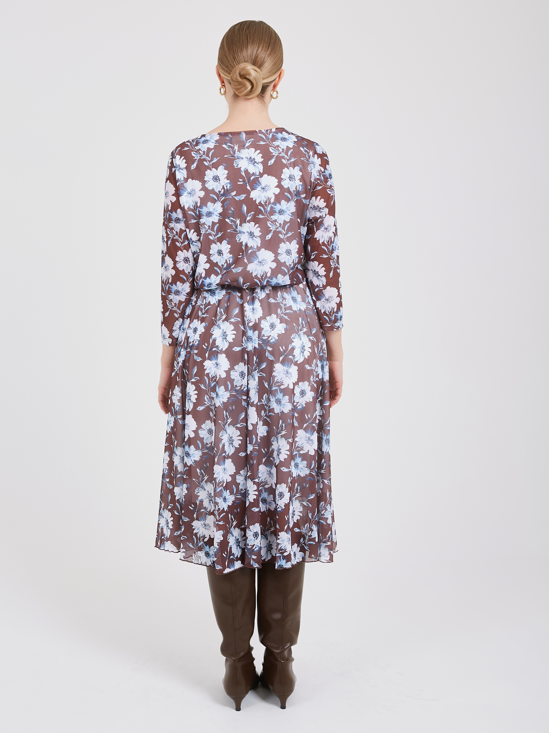 Нежное платье выполнено из мягкого, струящегося материала, подчеркивающего природную красоту обладательницы. Свободный покрой позволяет платью идеально сидеть на любой фигуре, даря комфорт и уверенность. Тонкая резинка деликатно обозначает талию, создавая легкий намек на женственную линию тела, сохраняя при этом чувство легкости и непринужденности. Нежный флористический голубой узор на насыщенном коричневом фоне добавляет романтичности и очарования, превращая каждый выход в праздник. Осень-Зима'25/26 Капсула "Вино из одуванчиков"