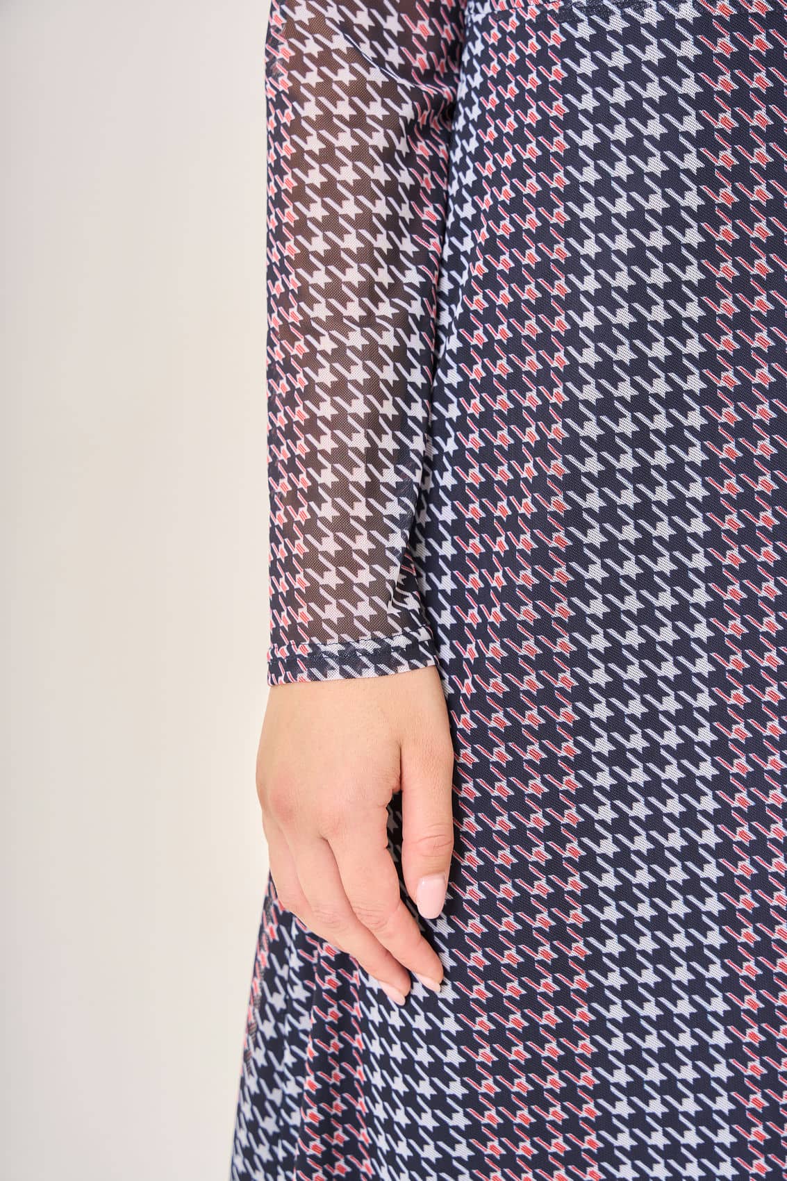 Платье с длинными рукавами и высоким воротником. Элегантный узор "гусиная лапка" в оттенках темно-синего, розового и белого придает образу изысканность и утонченность. Длина платья до середины икры создает гармоничный и привлекательный силуэт. Легкий струящийся материал приятно облегает фигуру, делая этот наряд идеальным выбором для особых случаев и романтических вечеров.