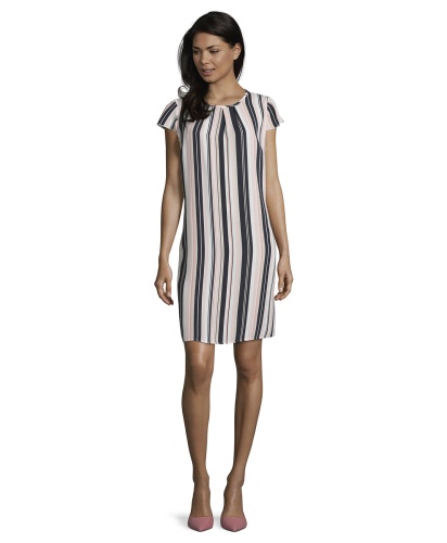 Легкое летнее платье - идеальный вариант для жаркой погоды. Трендовый принт в полоску визуально вытягивает силуэт. Платье свободного покроя, круглый вырез горловины, короткие рукава. Стильное платье отлично смотрится как с туфлями, так и со спортивной обувью.