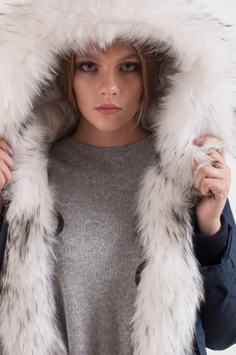 Теплое пуховое пальто. Плотная ткань верха. Прямой покрой, удлиненная спинка, кулиска на талии. Карманы пальто на клапанах. Кулиска по низу изделия. Оторочка капюшона из натурального меха енота.