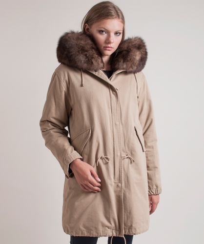 Теплое пуховое пальто прямого кроя. Плотная ткань верха. Кулиска на талии. Карманы пальто на клапанах. Пата с пуговицей по низу рукавов. Кулиска по низу изделия. Оторочка капюшона из натурального лисьего меха.