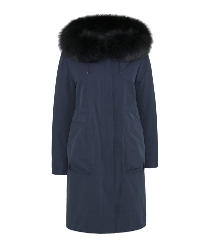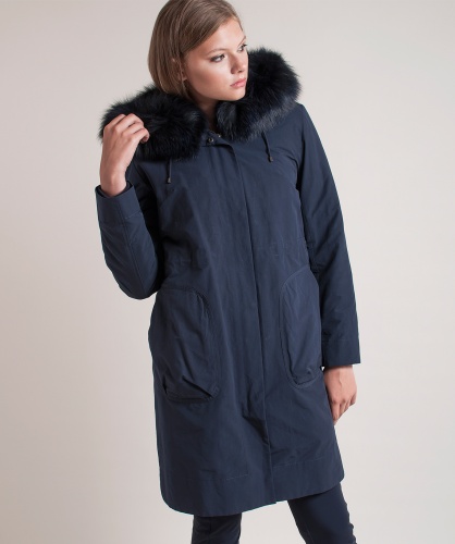 Теплая пихора на подкладке из меха кролика. Плотная ткань верха. Прямой покрой, кулиска с завышенной линией талии. Накладные карманы. Разрезы по бокам. Оторочка капюшона из натурального лисьего меха.